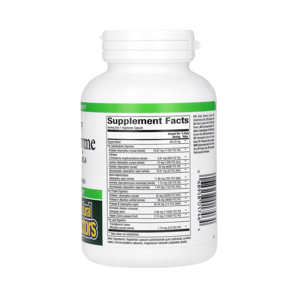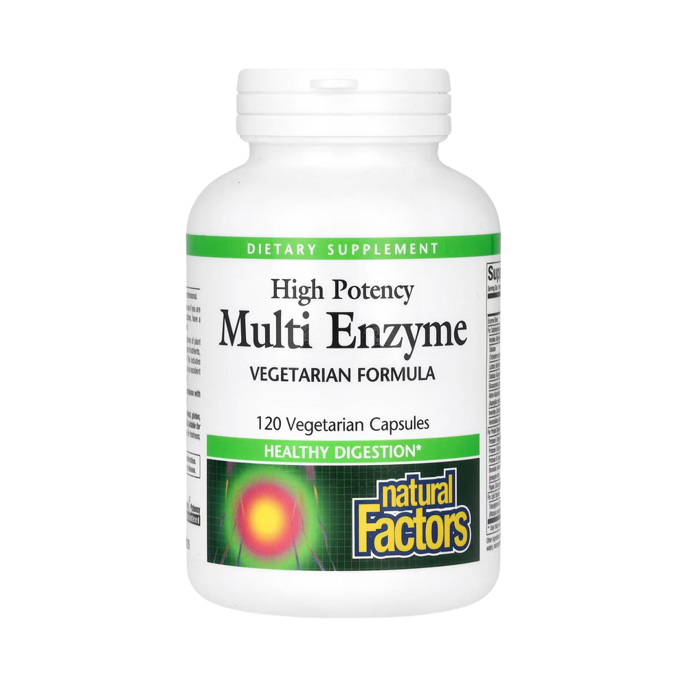Multi Enzyme capsules are the optimal digestive aid containing a full spectrum of plant derived enzymes in a single supplement. To help improve the body's absorption of nutrients, these valuable enzymes break down carbohydrates, proteins, and fats. This includes starch, polysaccharides, lactose, and other sugars. Natural supplementation is an excellent way to replenish enzymes lost from foods during cooking and processing.