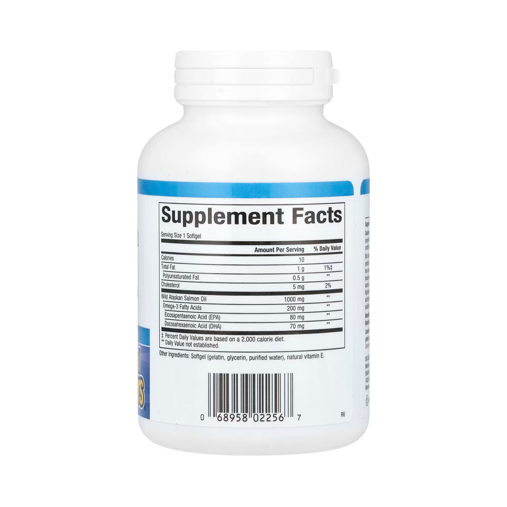 Wild salmon is a healthier choice than farmed salmon, which has been found to contain high antibiotic, PCB and dioxin levels. A source of omega-3 fatty acids and astaxanthin, wild salmon oil has a naturally occurring ratio of EPA to DHA. Wild salmon may be a better environmental choice because salmon farms can pollute coastal waters. The oil is extracted from already harvested salmon, using fish parts that would otherwise be wasted, thereby conserving existing stocks. Rigorously tested for purity, this product is guaranteed to meet or exceed the quality standards set forth by the Canadian government and the Council for Responsible Nutrition for environmental pollutants such as heavy metals, pesticides, dioxins, PCBs and other harmful compounds.