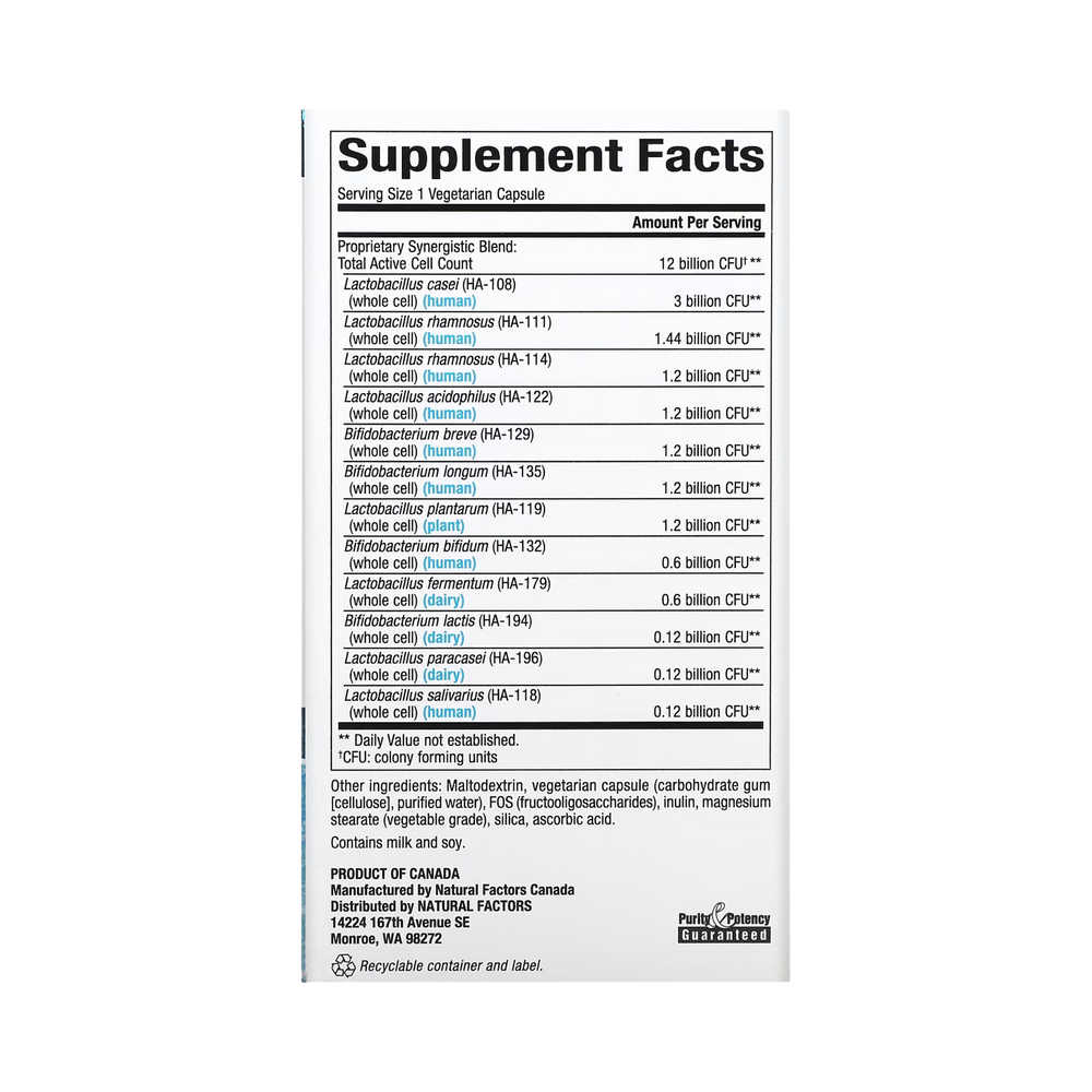 Enteric coating is not required for all probiotic strains. With regard to stomach acid resistance, not all strains are created equal. Natural Factors has carefully selected naturally acid-resistant strains so that they may be consumed at any time, with or without meals, and are safely delivered to the intestine unharmed. Our strains are tested for their viability in the stomach to ensure optimal absorption and efficacy.