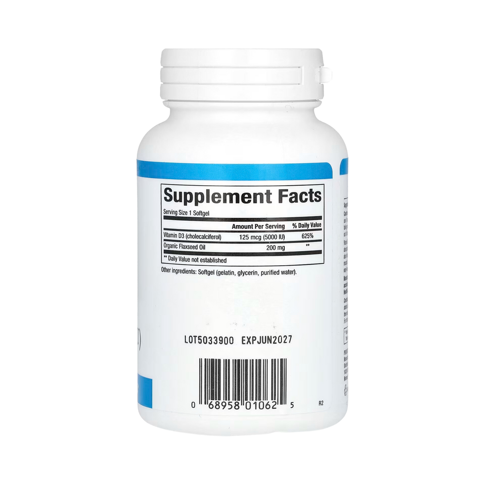 Vitamin D3 is essential for strong bones and teeth as it increases the body's absorption of calcium from food. Its role in regulating calcium levels also helps regulate the immune system and maintain healthy nerves and muscles. Vitamin D3 is carefully blended with organic flaxseed oil in an easy-to-swallow softgel.