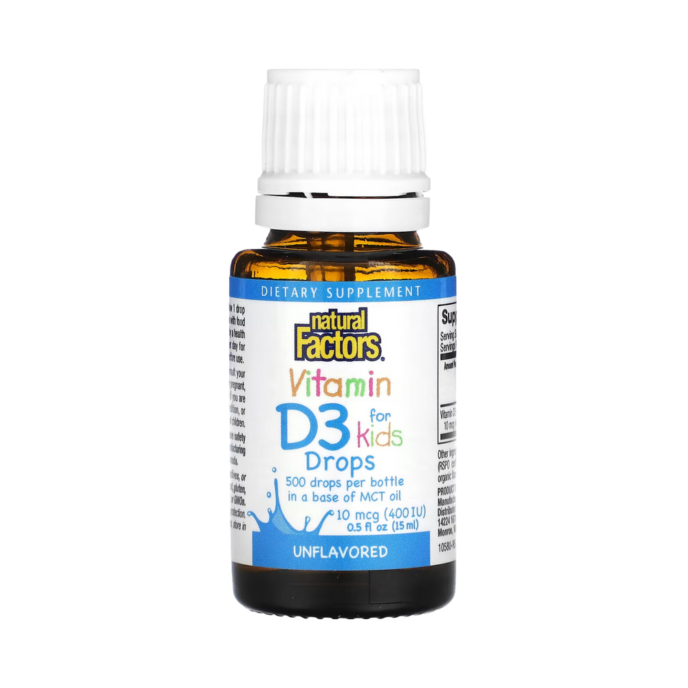 Vitamin D3 is essential for strong bones and teeth as it increases the body's absorption of calcium from food. Its role in regulating calcium levels also helps regulate the immune system and maintain healthy nerves and muscles. Vitamin D3 is a potent liquid supplement that is carefully blended in a mixture of medium chain triglycerides (sourced from certified sustainable palm kernel and coconut oil) and flaxseed oils providing 10 mcg (400 IU) of vitamin D3 in just one little drop.