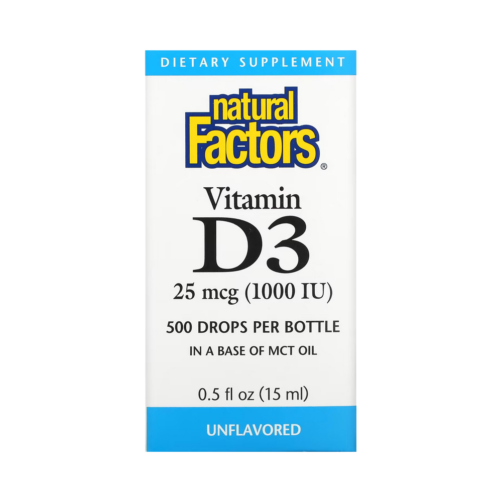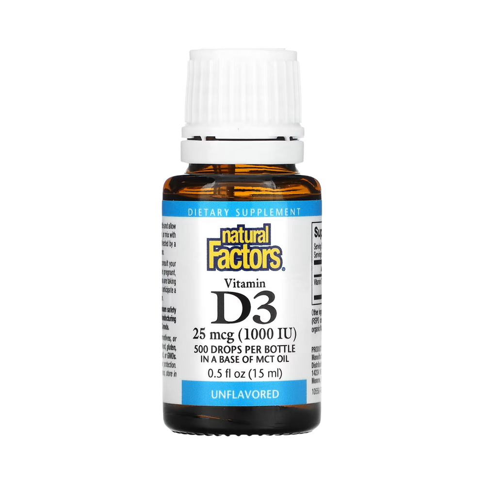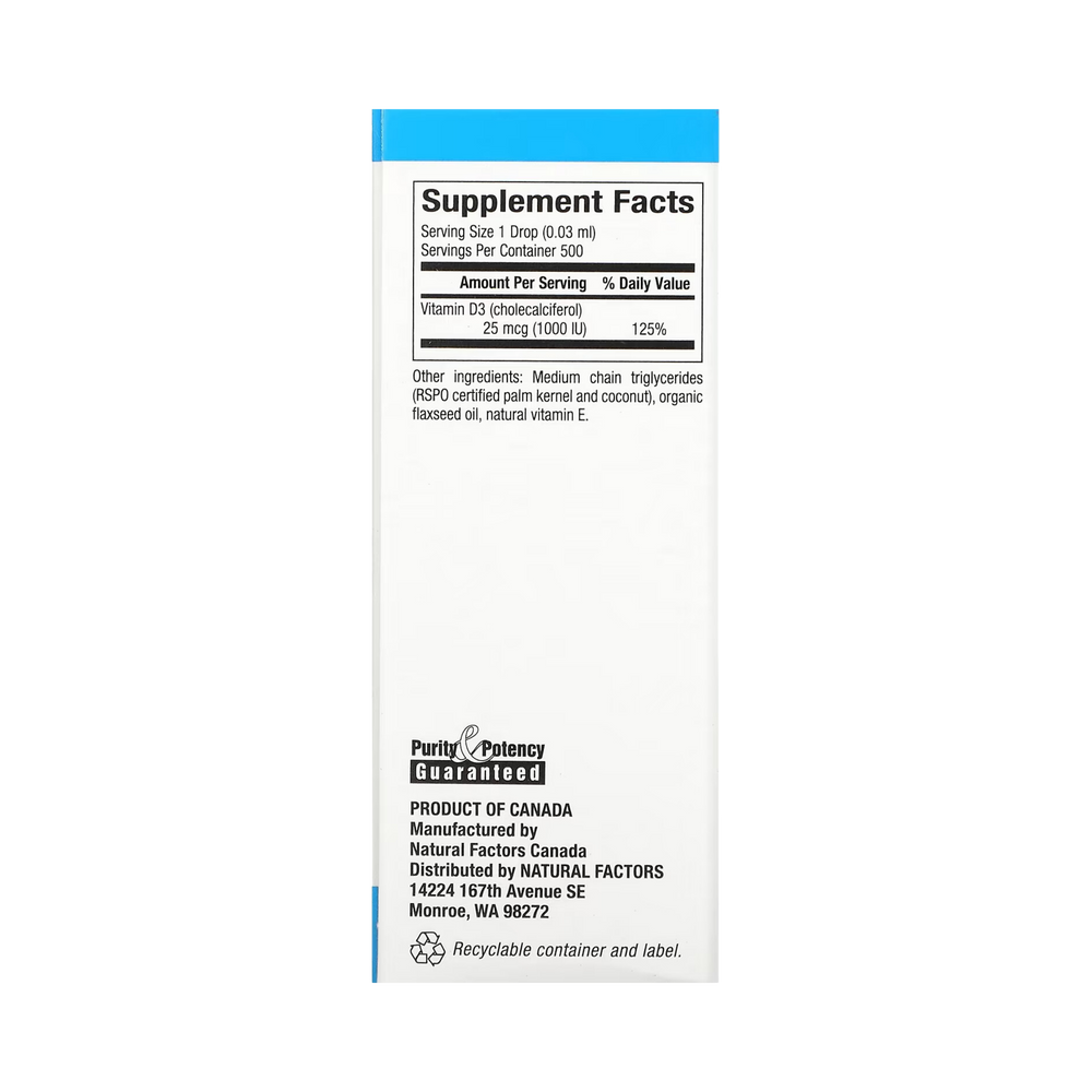 Vitamin D3 is essential for strong bones and teeth as it increases the body's absorption of calcium from food Its role in regulating calcium levels also helps regulate the immune system and maintain healthy nerves and muscles. Vitamin D3 is a potent liquid supplement that is carefully blended in a mixture of medium chain triglycerides (sourced from certified sustainable palm and coconut oil) and flaxseed oils providing 25 mcg (1000 IU) of vitamin D3 in just one little drop. Also available in 10 mcg (400 IU) potency for children.