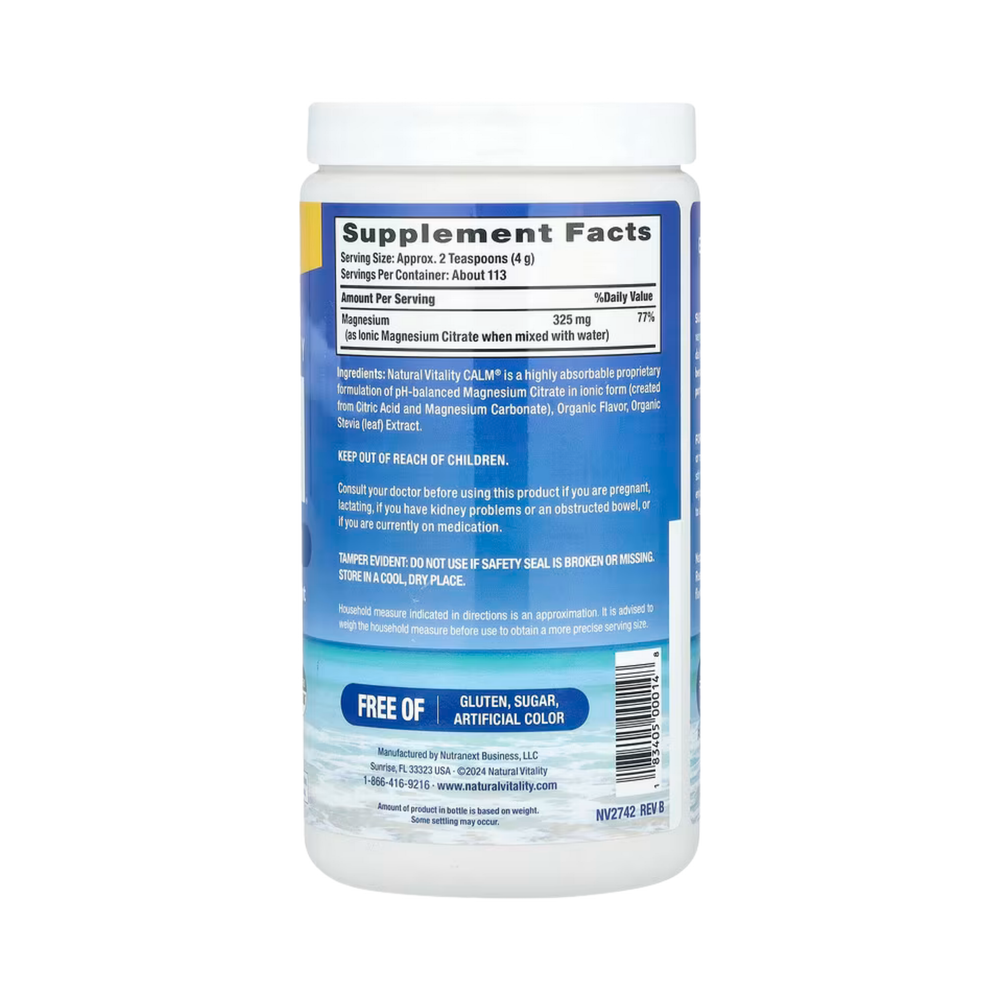 Natural vitality calm® is a highly absorbable proprietary formulation of ph-balanced magnesium citrate in ionic form (created from citric acid and magnesium carbonate), organic flavor, organic stevia (leaf) extract.