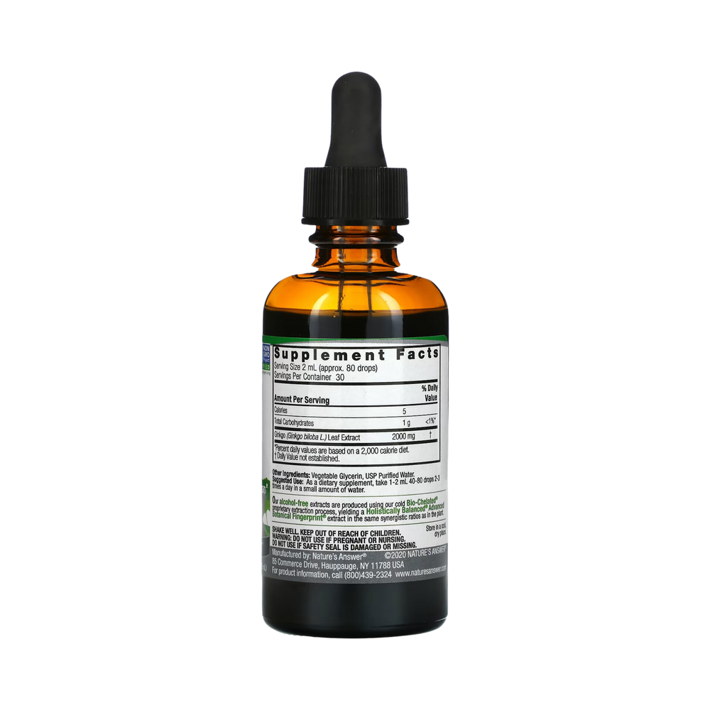 Nature’s Answer® Alcohol Free Ginkgo Leaf Fluid Extract is a concentrated herbal extract made from Ginkgo (Ginkgo biloba) leaves.