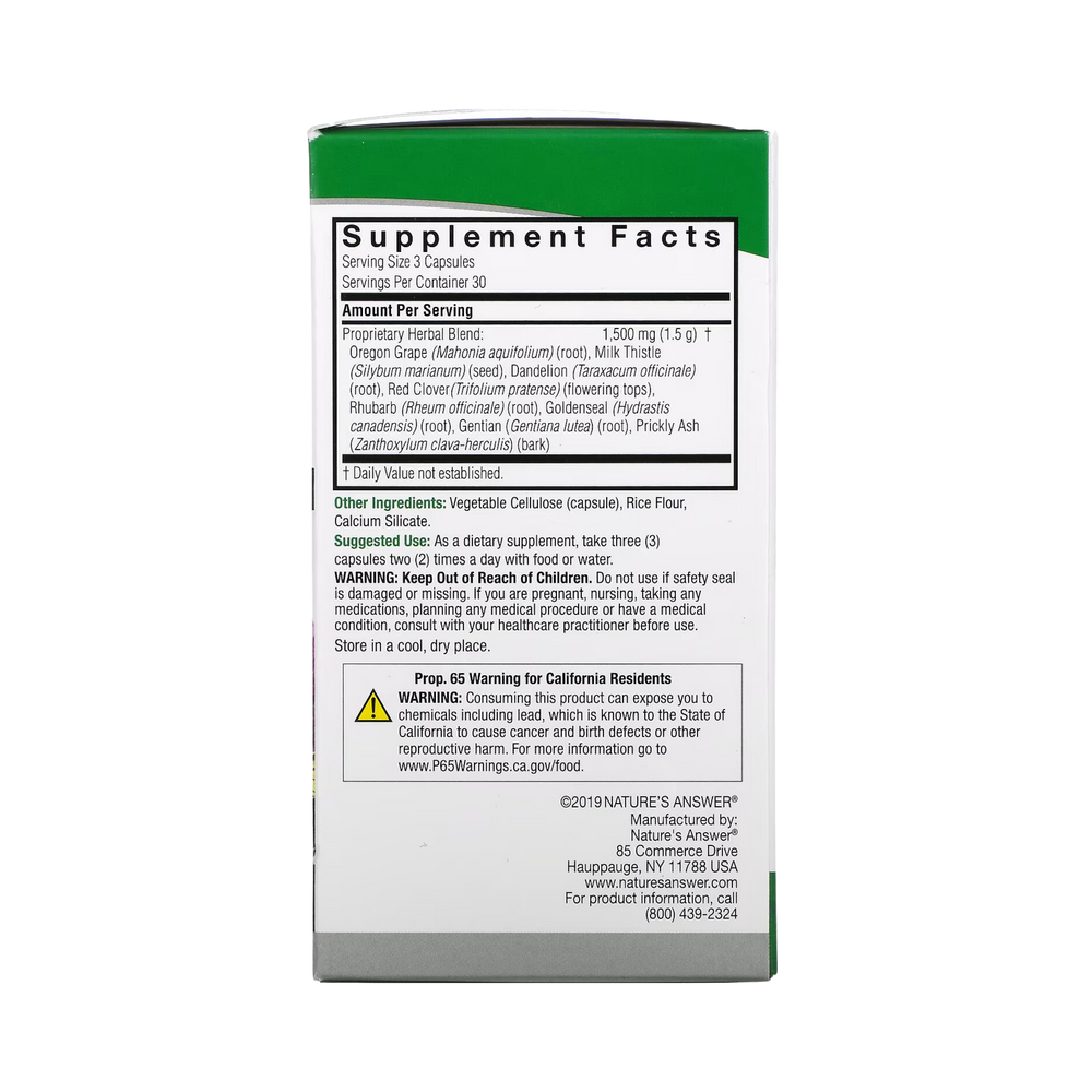Oregon Grape (Mahonia aquifolium) (root), Milk Thistle (Silybum marianum) (seed), Dandelion (Taraxacum officinale) (root), Red Clover (Trifolium pratense) (flowering tops), Rhubarb (Rheum officinale) (root), Goldenseal (Hydrastis canadensis) (root), Gentian (Gentiana lutea) (root), Prickly Ash (Zanthoxylum americanum) (bark). 1,500 mg (1.5 g) †