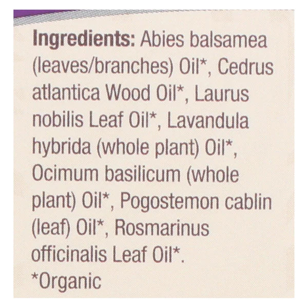 Abies balsamea (leaves/branches) oil*, cedrus atlantica wood oil*, laurus nobilis leaf oil*, lavandula hybrida (whole plant) oil*, ocimum basilicum (whole plant) oil*, pogostemon cablin (leaf) oil*, rosmarinus officinalis leaf oil*.