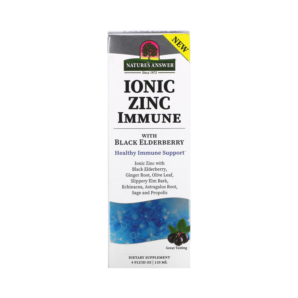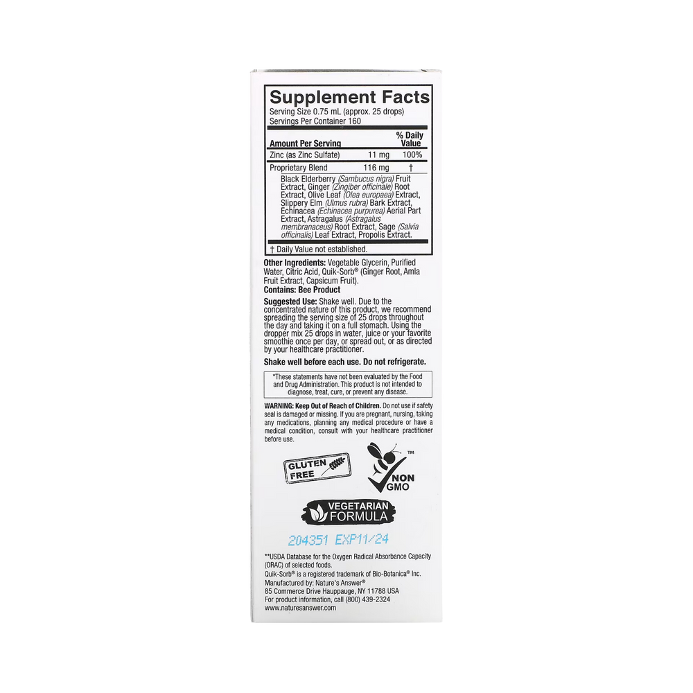 Nature’s Answer Ionic Zinc Immune delivers zinc in a form that is easily broken down and is able to pass directly to where it can be absorbed*. This exclusive Ionic liquid brings together 100% Daily Value (11mg) of Zinc, along with a combination of botanicals including Sambucus Black Elderberry, Ginger Root, Olive Leaf, Slippery Elm Bark, Echinacea, Astragalus Root, Sage, and health-supporting* propolis. This is a unique, well-rounded immune support product.