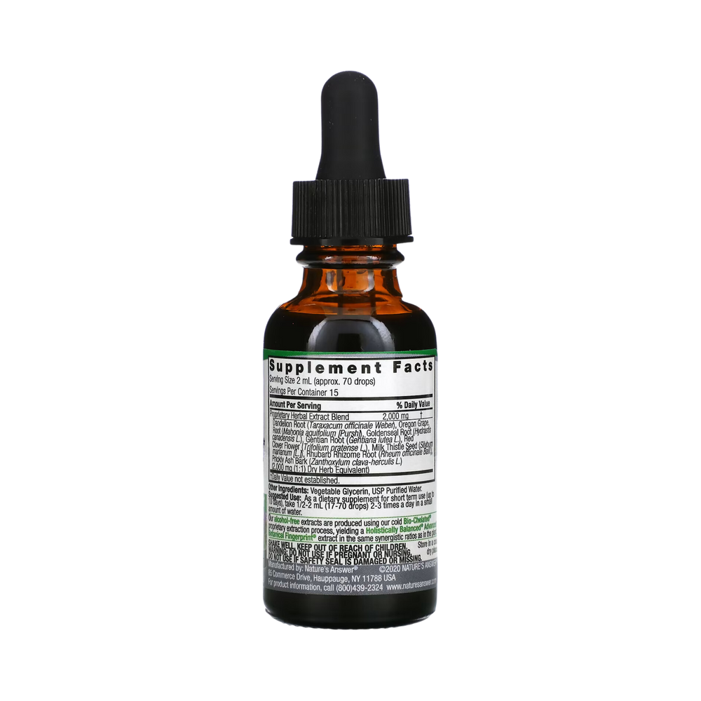 Dandelion Root (Taraxacum officinale Weber), Oregon Grape Root (Mahonia aquifolium [Pursh]), Goldenseal Root (Hydrastis canadensis L.), Gentian Root (Gentiana lutea L.), Red Clover Flower (Trifolium pratense L.), Milk Thistle Seed (Silybum marianum [L.]), Rhubarb (Rheum officinale Baill.), Prickly Ash Bark (Zanthoxylum clava-herculis L.) (2,000 mg (1:1) Dry Herb Equivalent