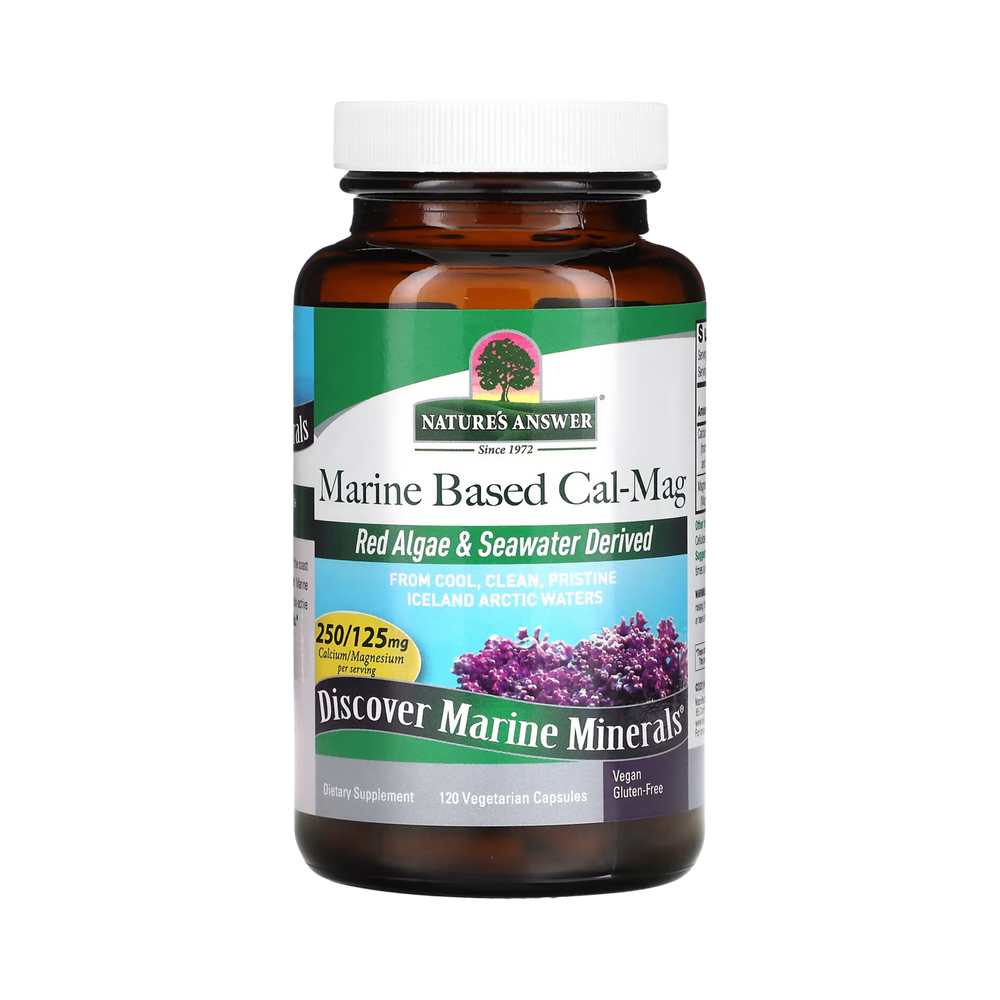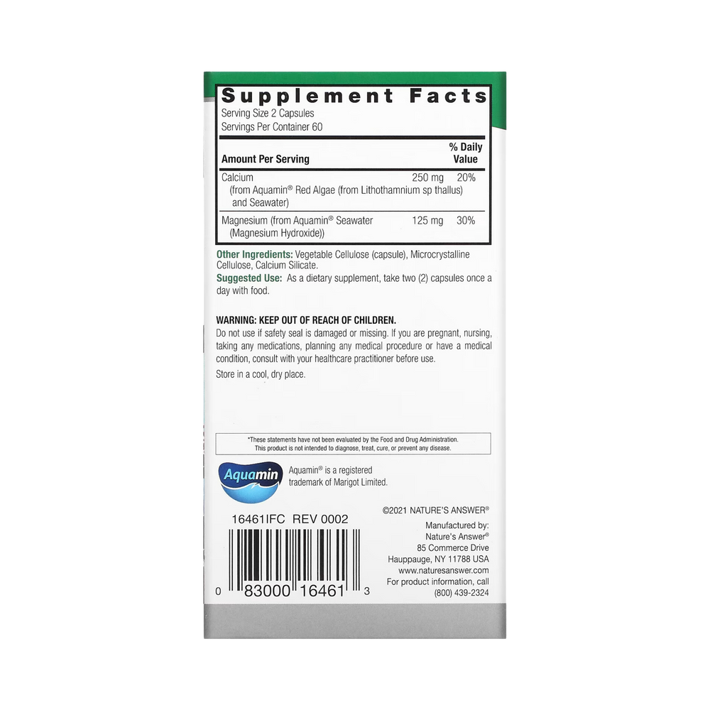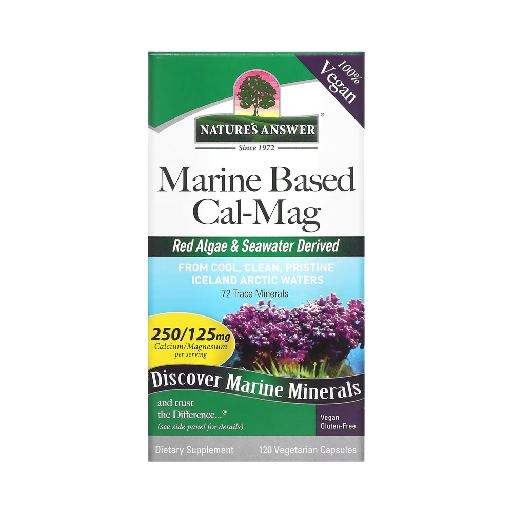 Marine Based Cal-Mag Veggie Caps offer 250 mg of Calcium along with 125 milligrams of Magnesium per serving. These bioavailable minerals are sourced from Aquamin® Red Algae and Seawater, harvested in the cool, clean, pristine waters off the coast of Iceland, in an area untouched by industry. The warm waters of the Gulfstream meet the cold clean waters of the Arctic creating perfect conditions for Red Algae. This Marine Calcium, Magnesium, and Multi-Mineral Seawater complex supplies bioactive Magnesium, Calcium, and 72 additional trace minerals.