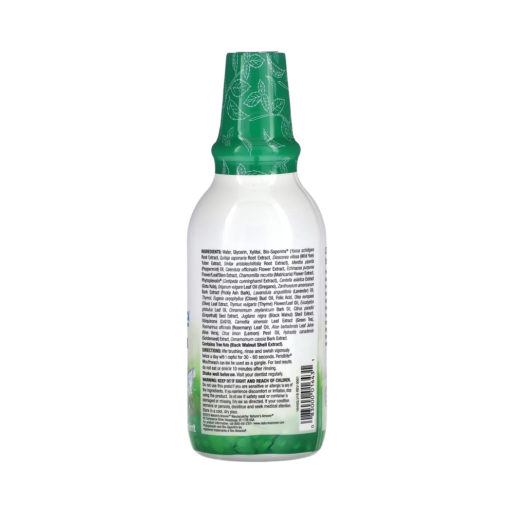 PerioBrite® Mouthwash contains a unique combination of soothing wildcrafted herbs, well-known for their cleansing action, together with CoQ10, Folic Acid, Oregano, Cinnamon, and Clove to support tissue and gum health. It naturally moistens gum tissue for long-lasting results when used as part of an oral health program. PerioBrite® mouthwash helps to freshen breath, and provides oral energizing with a cool, sparkling minty-fresh feeling