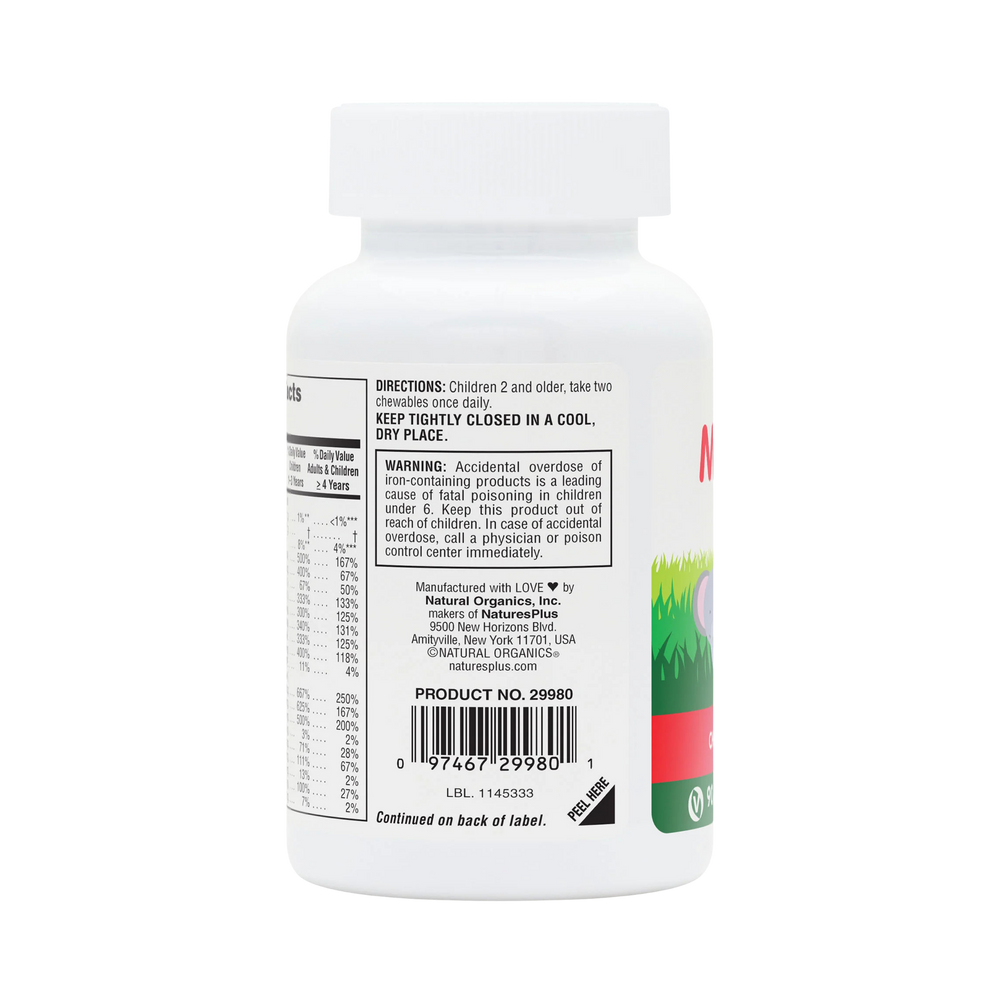 Natural sweeteners (non-GMO can sugar, fructose), natural flavors, microcrystalline cellulose, vegetable cellulose, citric acid (for flavor), calcium carbonate, natural color (grape, beet juice, annatto, curcumin), magnesium stearate, guar gum, ferrous fumarate, magnesium oxide, spirulina (naturally rich in essential nutrients), zinc oxide, rose hips (rosa canina fruit), stearic acid, rice bran, papaya fruit, carrot, west indian cherry (malpighia glabra fruit), broccoli, spinach, mango fruit.
