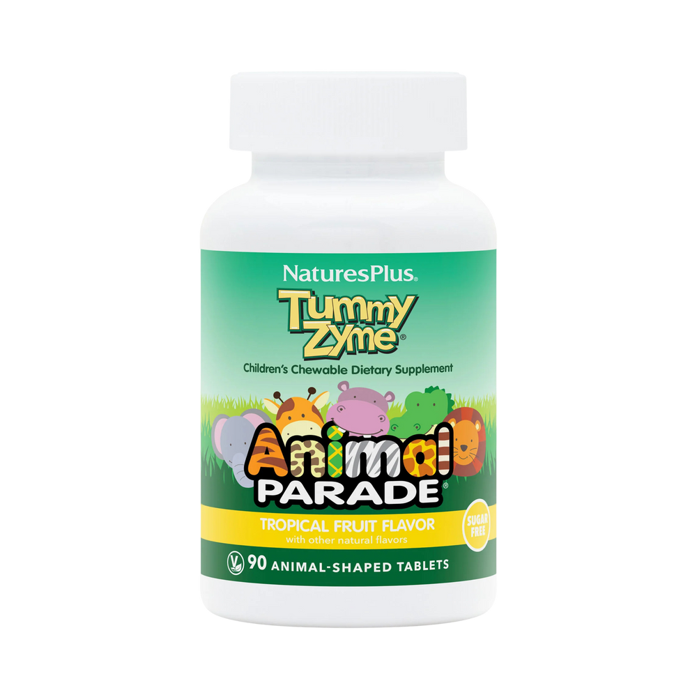Tummies are great when they are working right, but when discomfort takes over that makes for a very unhappy and uncomfortable child! It's Animal Parade® Tummy Zyme® to the rescue! This delicious tropical fruit-flavor chewable provides quick, first-class digestive support and tummy-taming balance with its highly active enzymes, millions of live probiotic cells and enzyme- rich blend of whole foods. So when discomfort strikes, it's time for the power of Tummy Zyme!