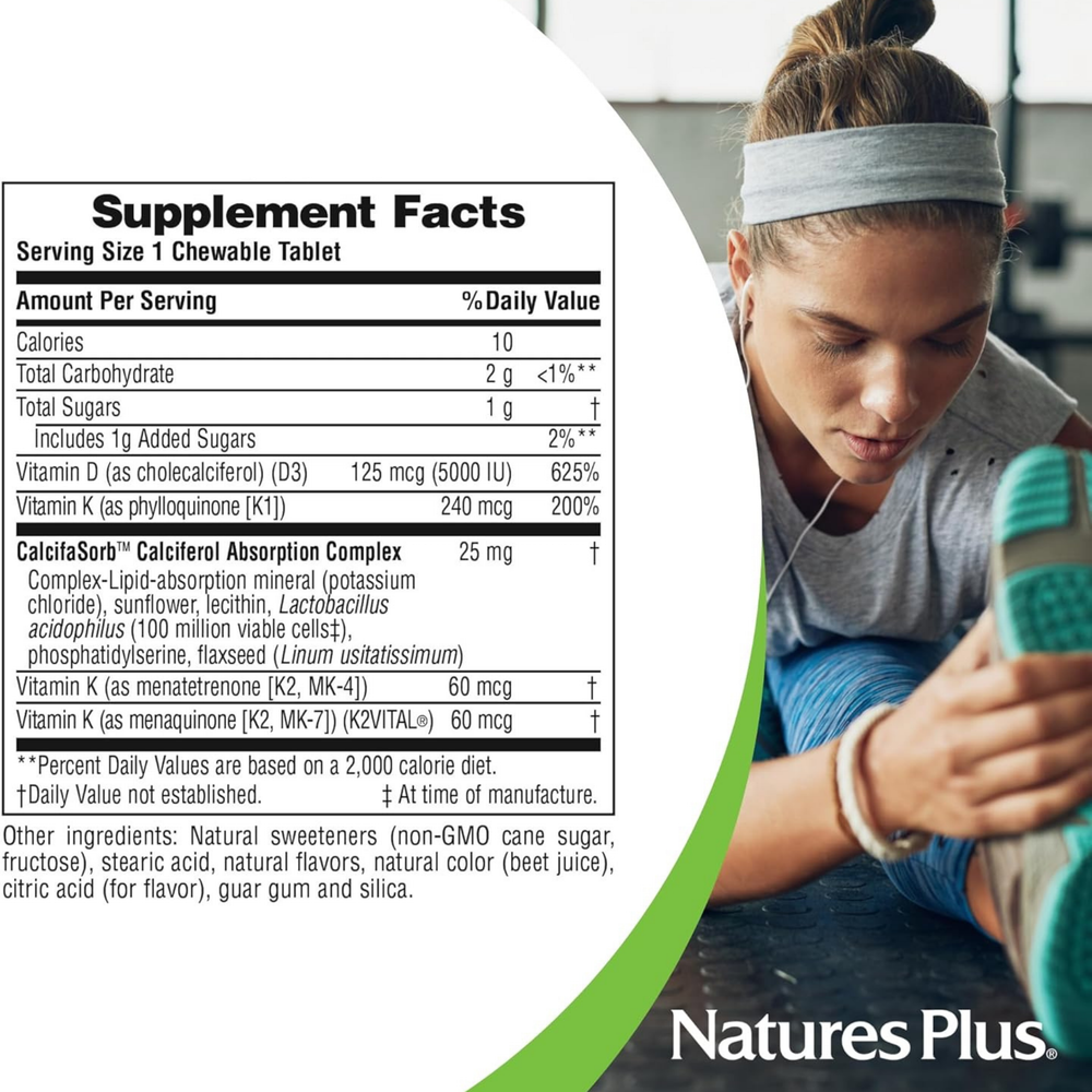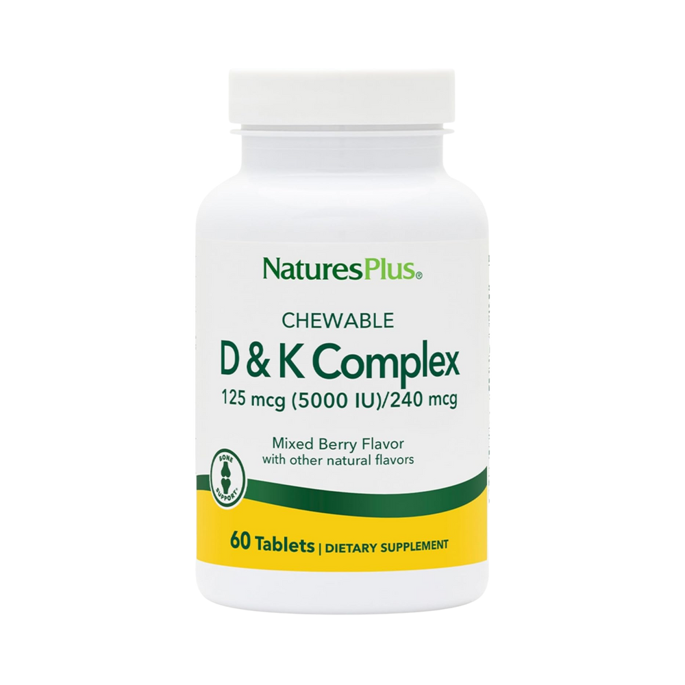 Extensive studies of Vitamins D and K in calcium metabolism indicate these two vitamins have a synergistic relationship in supporting bone strength and cardiovascular health. NaturesPlus® D & K Complex delivers high potencies in a delicious chewable! Vitamin D3 is also recognized for its role in immune health, while vitamin K2 is known to help direct calcium to bones rather than arteries and joint spaces.