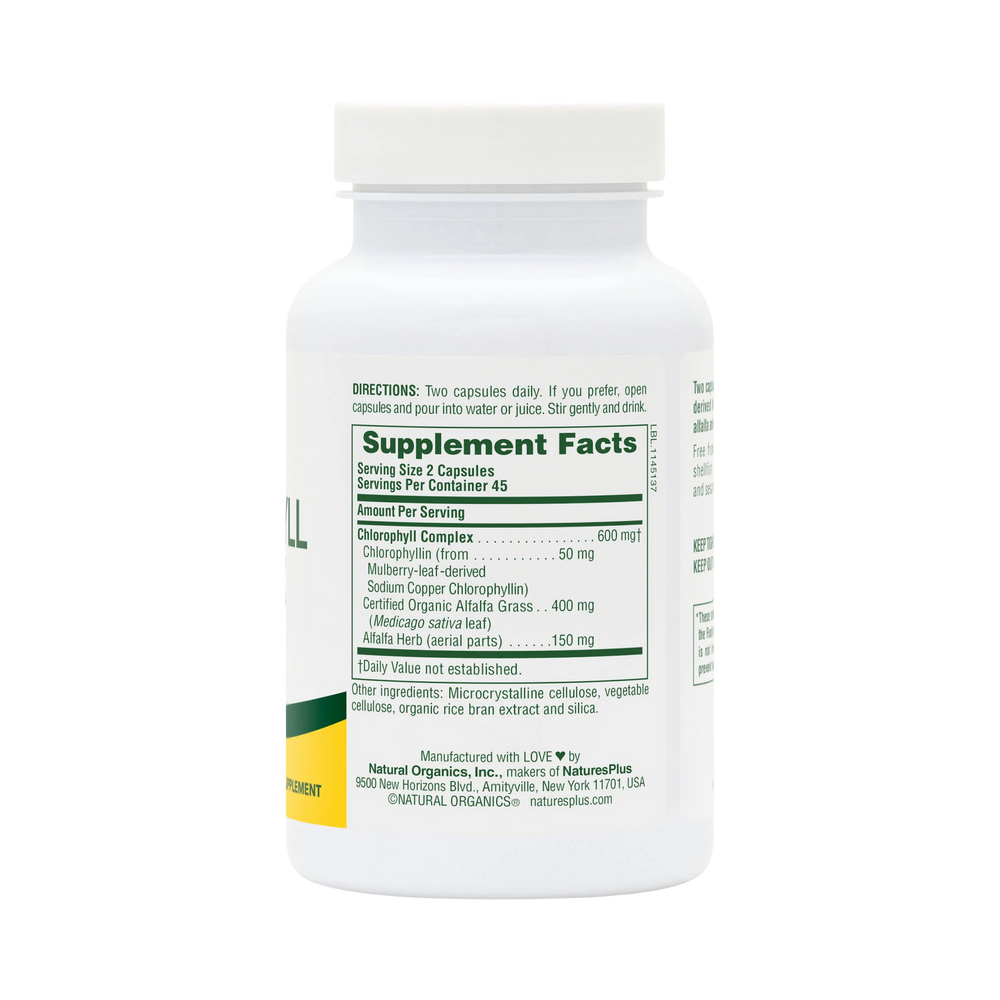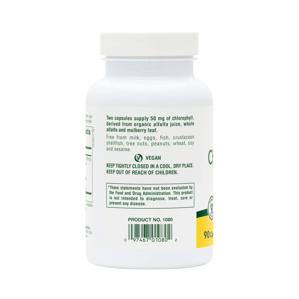 Two capsules supply 50 mg of chlorophyll, derived from organic alfalfa juice, whole alfalfa and mulberry leaf.