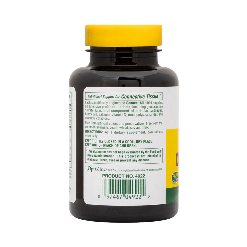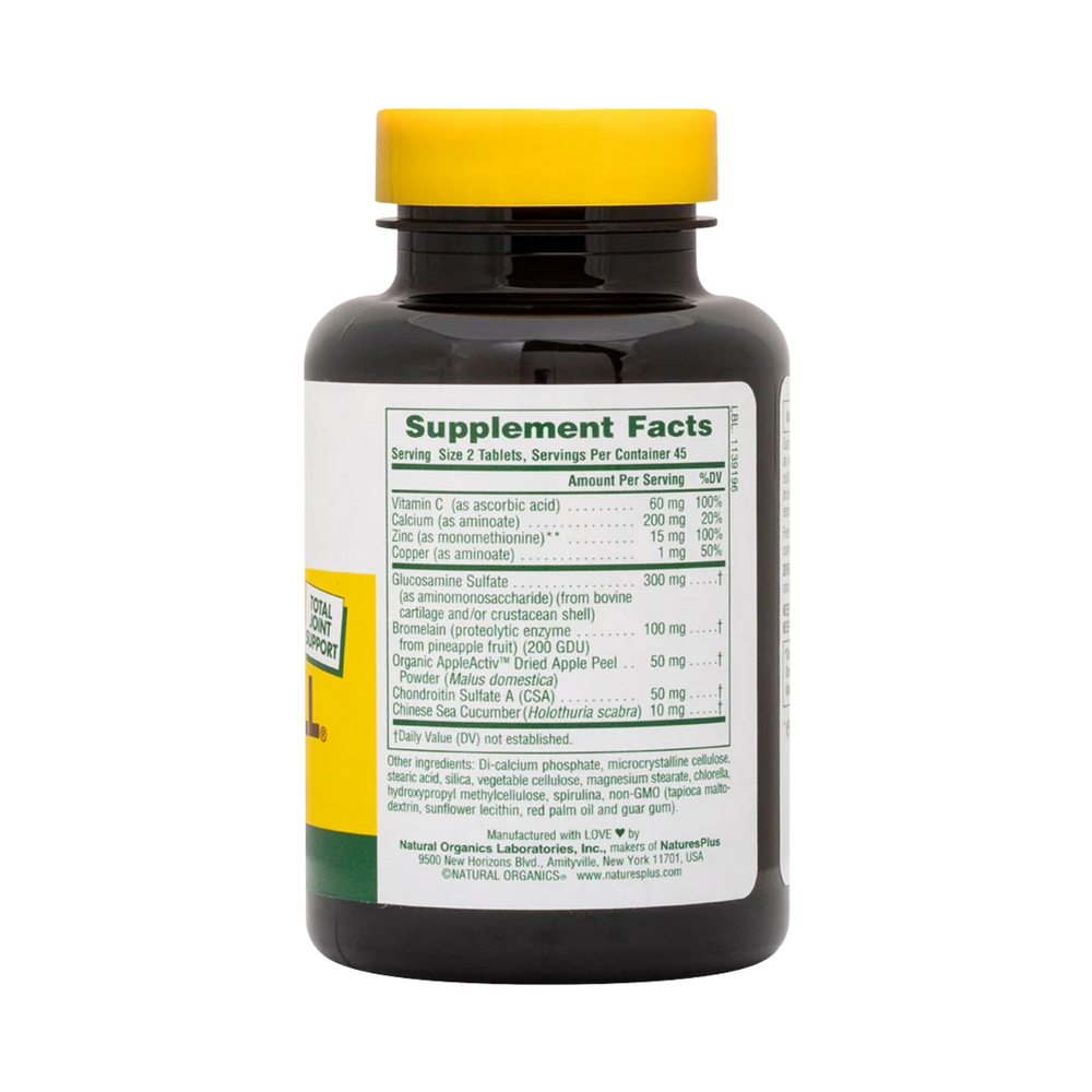 Vitamin C (as ascorbic acid), Calcium (as aminoate), Zinc (as monomethionine), Copper (as aminoate), Glucosamine Sulfate (as aminomonosaccharide) (from bovine cartilage and/or crustacean shell), Bromelain (proteolytic enzyme from pineapple fruit), Organic AppleActiv™ Dried Apple Peel Powder (Matus domestica), Chondroitin Sulfate A (CSA), Chinese Sea Cucumber (Holothuria scabra). Other ingredients: microcrystalline cellulose, di-calcium phosphate, vegetable cellulose, stearic acid, magnesium stearate, silica, spirulina, hydroxypropyl methylcellulose, chlorella, non-GMO (tapioca maltodextrin, sunflower lecithin and guar gum).