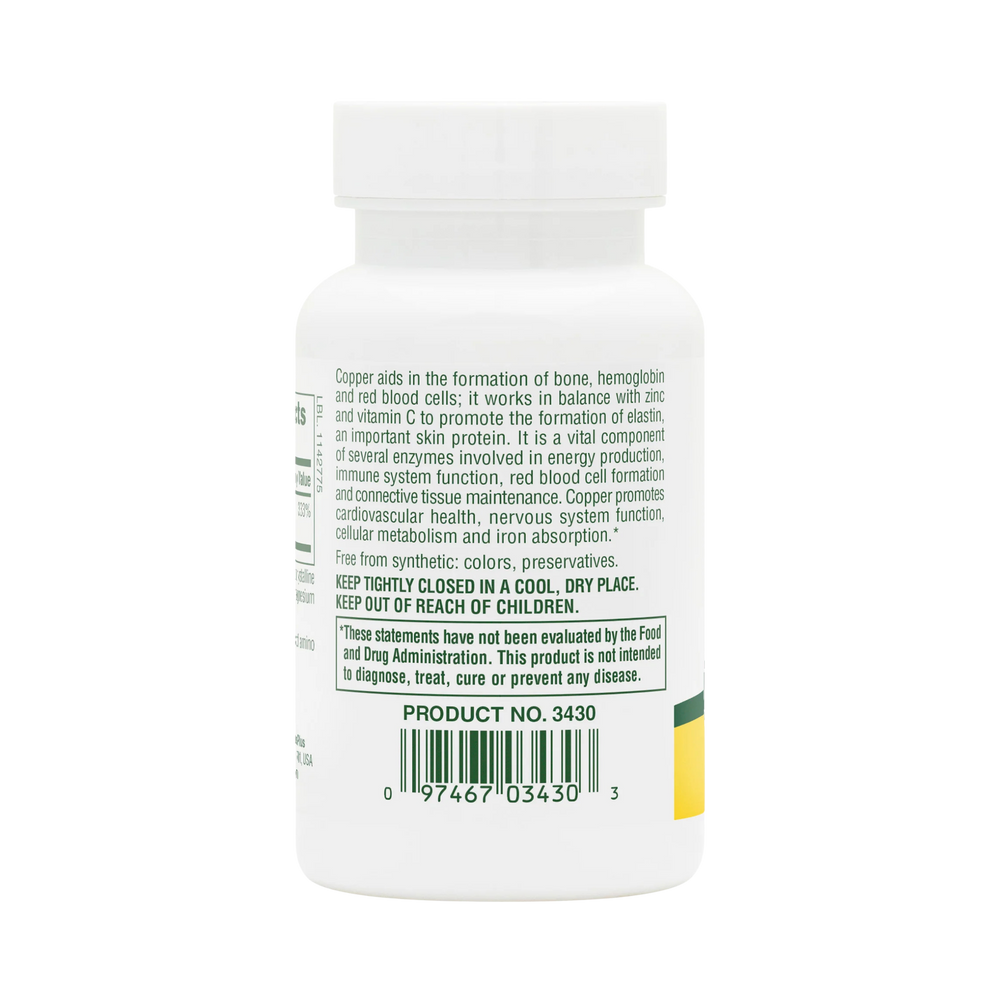 Copper aids in the formation of bone, hemoglobin and red blood cells; it works in balance with zinc and vitamin C to promote the formation of elastin, an important skin protein. It is a vital component of several enzymes involved in energy production, immune system function, red blood cell formation and connective tissue maintenance. Copper promotes cardiovascular health, nervous system function, cellular metabolism and iron absorption.