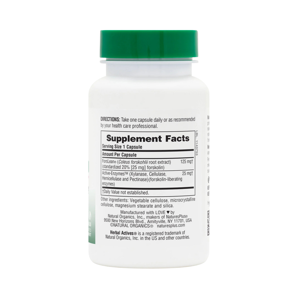 ForsLean® (Coleus forskohlii root extract), Active-Enzymes™ (Xylanase, Cellulase, Hemicellulase and Pectinase) (forskolin-liberating enzymes). Other ingredients: Microcrystalline cellulose, vegetable cellulose, magnesium stearate, silica and purified water.