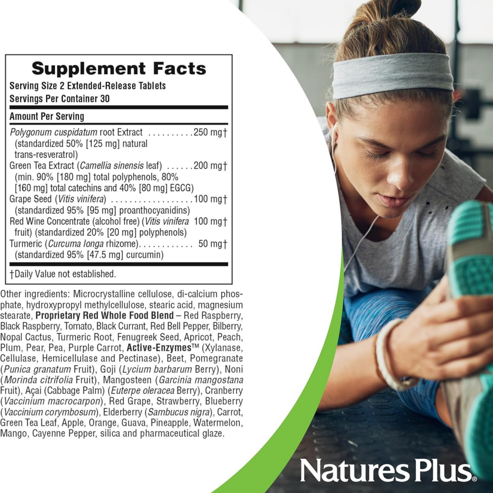 Polygonum cuspidatum root Extract, Green Tea Extract (Camellia sinensis leaf), Grape Seed (Vitis vinifera), Red Wine Concentrate (alcohol free) (Vitis vinifera fruit), Turmeric (Curcuma longa rhizome). Other ingredients: Microcrystalline cellulose, di-calcium phosphate, hydroxypropyl methylcellulose, stearic acid, magnesium stearate, Proprietary Red Whole Food Blend (Red Raspberry, Black Raspberry, Tomato, Black Currant, Red Bell Pepper, Bilberry, Nopal Cactus, Turmeric Root, Fenugreek Seed, Apricot, Peach, Plum, Pear, Pea, Purple Carrot), Active-Enzymes™ (Xylanase, Cellulase, Hemicellulase and Pectinase), Beet, Pomegranate (Punica granatum Fruit), Goji (Lycium barbarum Berry), Noni (Morinda citrifolia Fruit), Mangosteen (Garcinia mangostana Fruit), Acai (Cabbage Palm) (Euterpe oleracea Berry), Cranberry (Vaccinium macrocarpon), Red Grape, Strawberry, Blueberry (Vaccinium corymbosum), Elderberry (Sambucus nigra), Carrot, Green Tea Leaf, Apple, Orange, Guava, Pineapple, Watermelon, Mango, Cayenne Pepper, silica and pharmaceutical glaze.