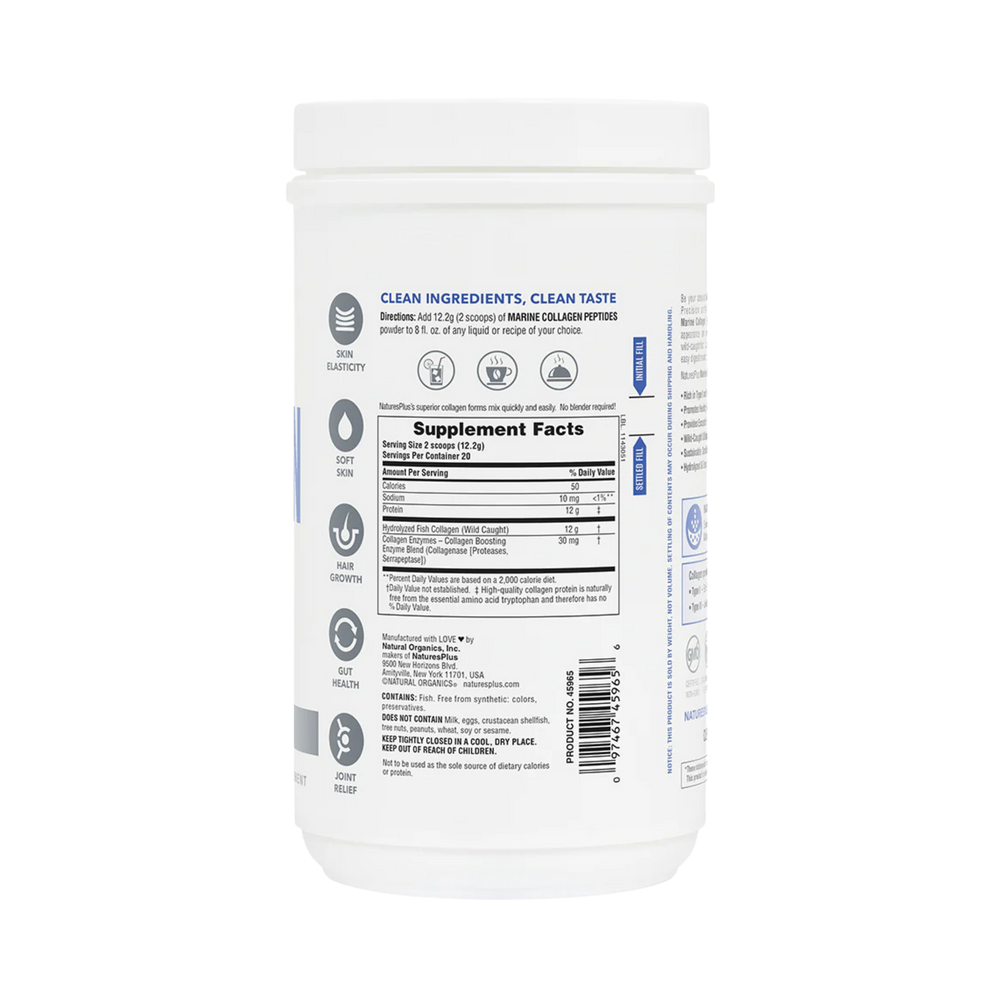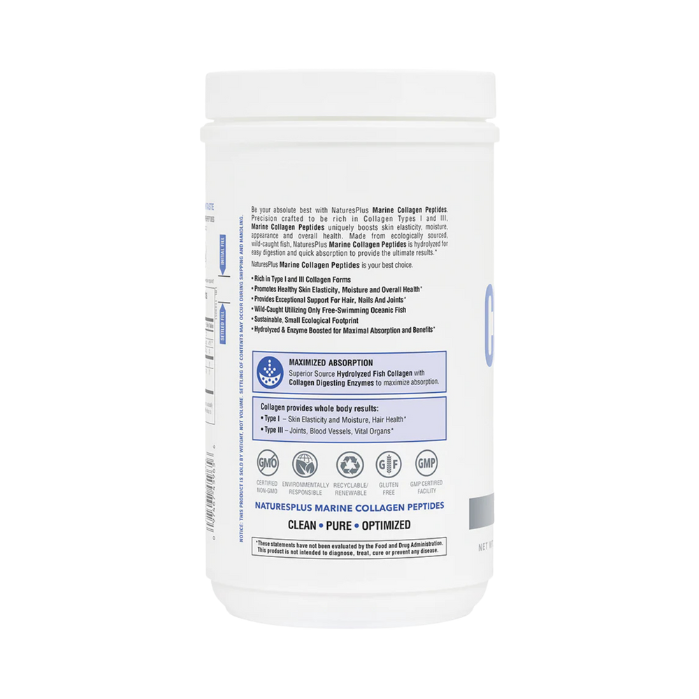 Be your absolute best with NaturesPlus Marine Collagen Peptides. Precision crafted to be rich in Collagen Types I and III, Marine Collagen Peptides uniquely boosts skin elasticity, moisture, appearance and overall health. Made from ecologically sourced, wild-caught fish, NaturesPlus Marine Collagen Peptides is hydrolyzed for easy digestion and quick absorption to provide the ultimate results.