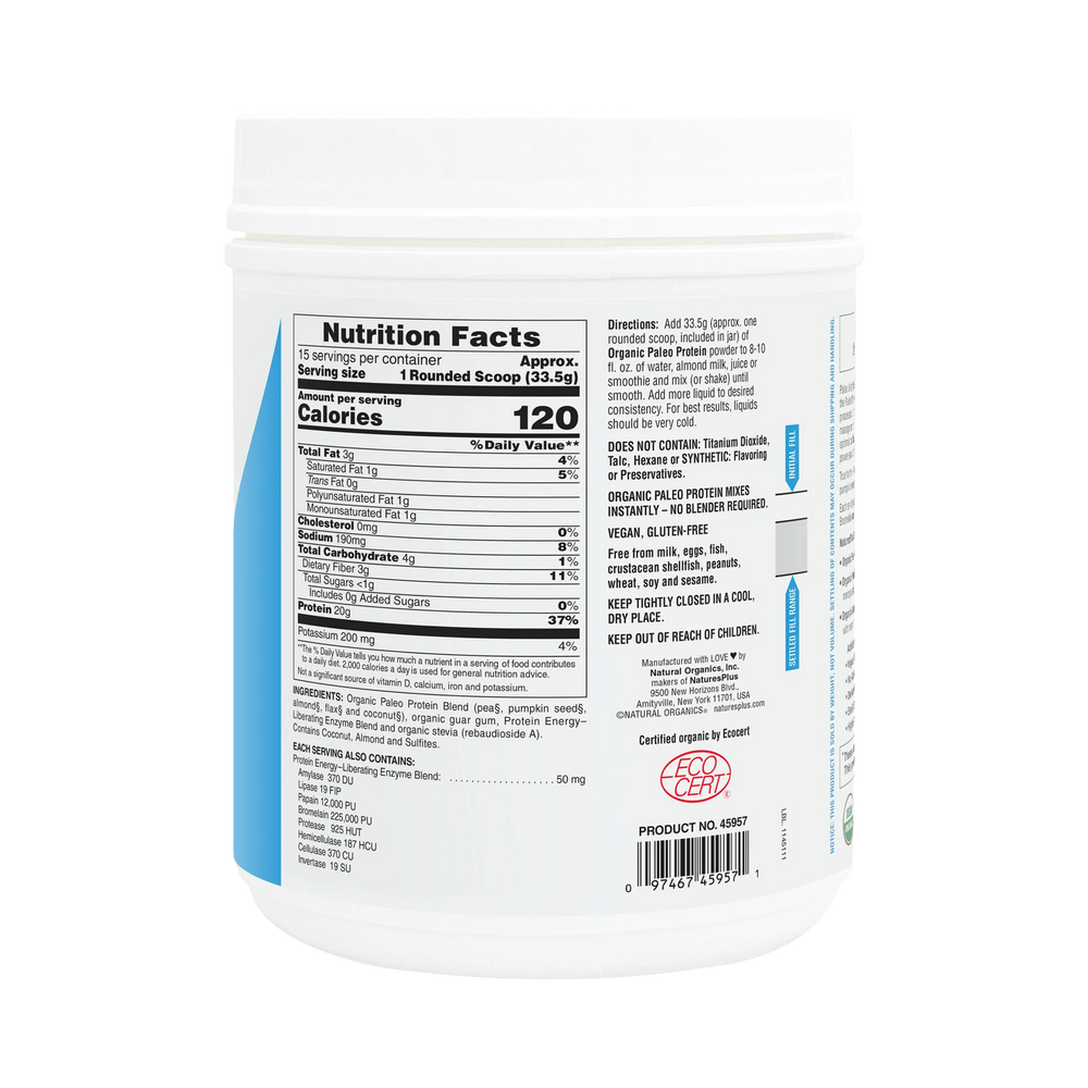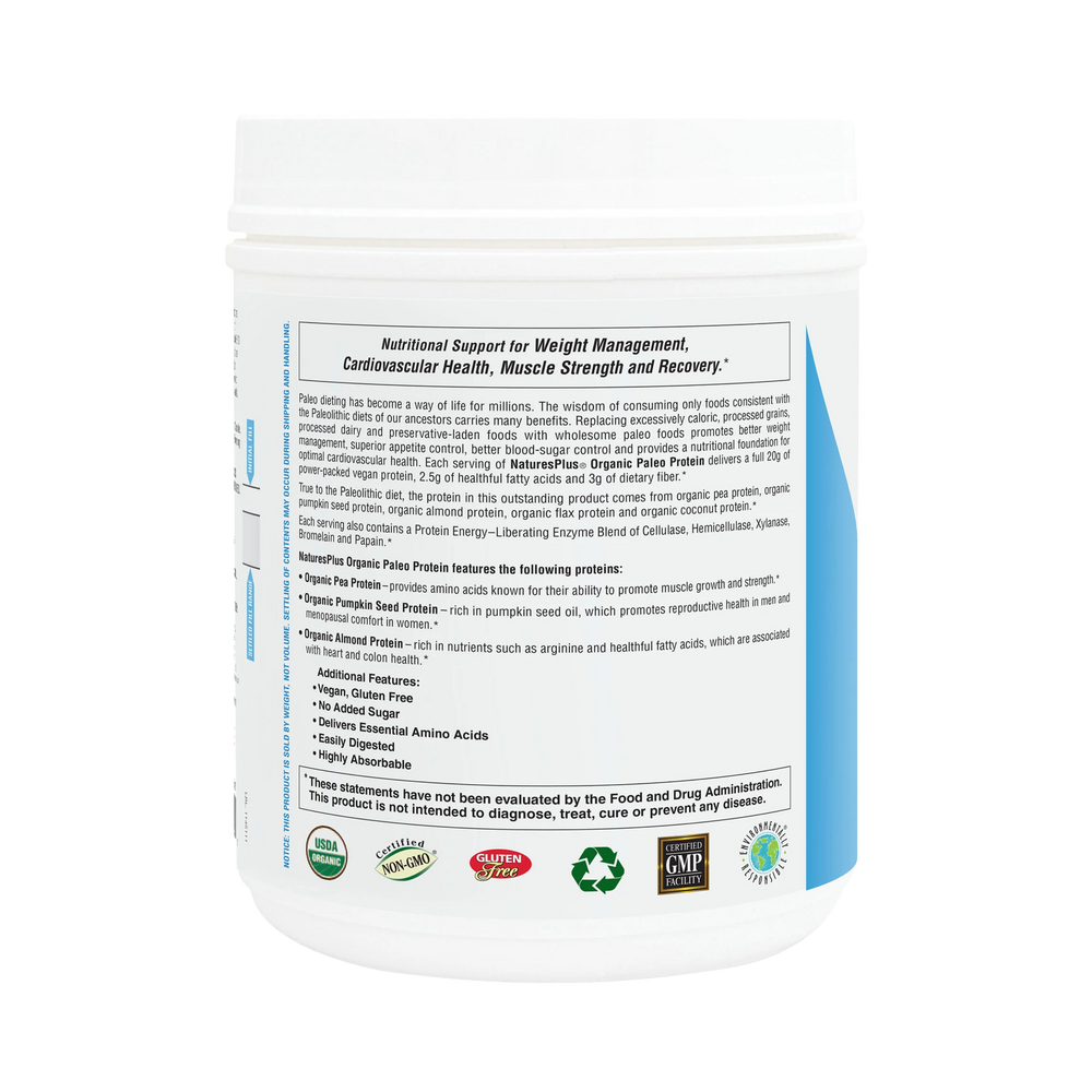 Paleo dieting has become a way of life for millions. The wisdom of consuming only foods consistent with the Paleolithic diets of our ancestors carries many benefits. Replacing excessively caloric, processed grains, processed dairy and preservative-laden foods with wholesome paleo foods promotes better weight management, superior appetite control, better blood-sugar control and provides a nutritional foundation for optimal cardiovascular health. Each serving of NaturesPlus® Organic Paleo Protein delivers a full 20 g of power-packed vegan protein, 2.5g of healthful fatty acids and 3g of dietary fiber.