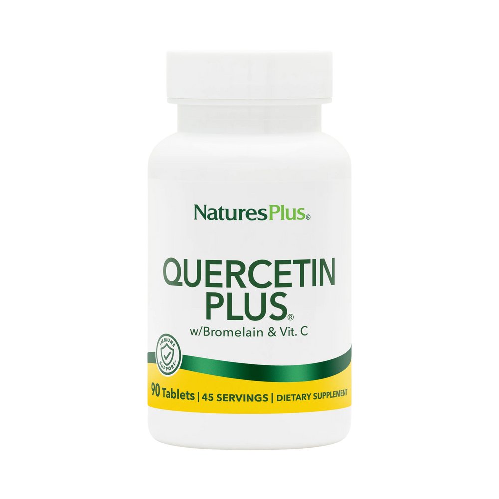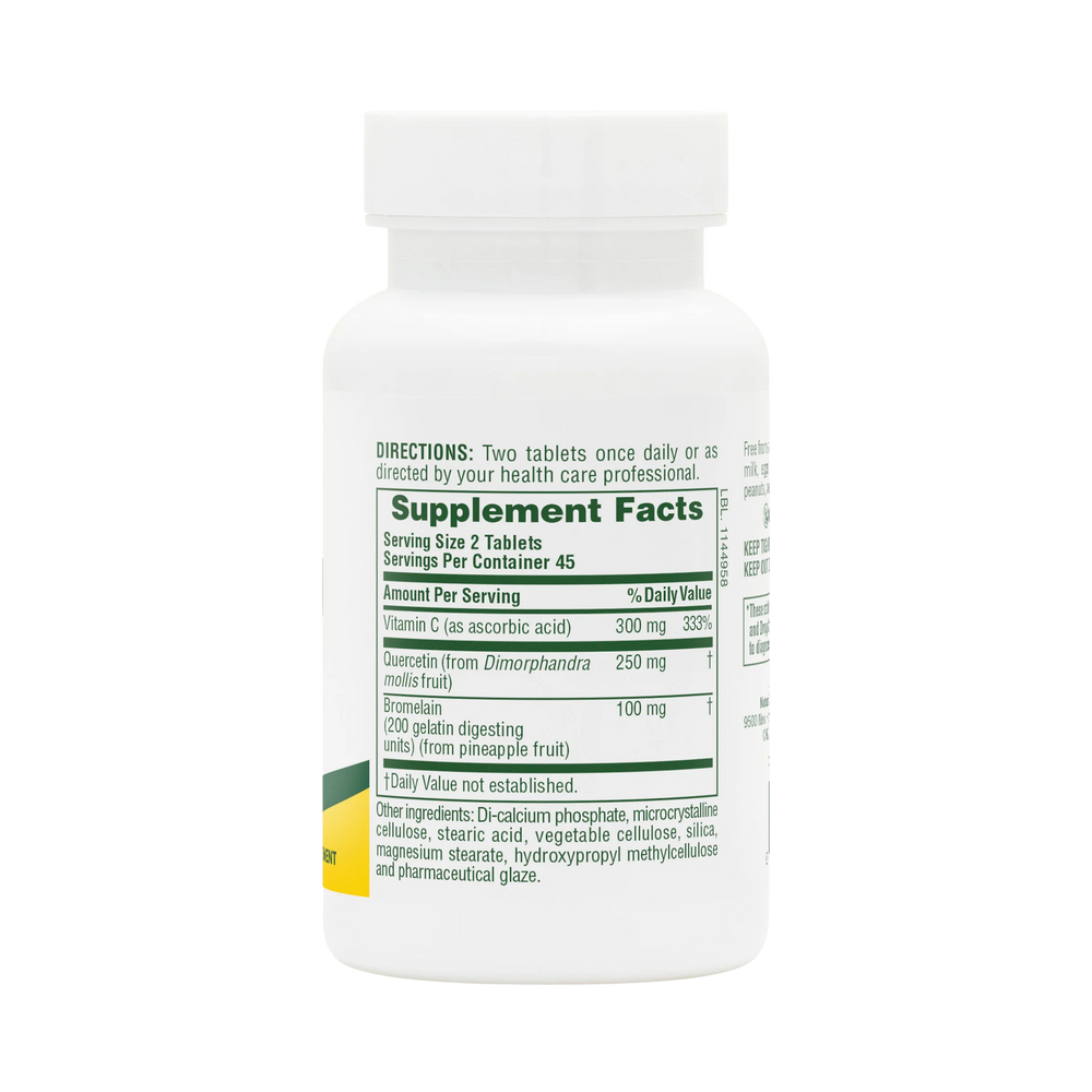 Vitamin C (as ascorbic acid), Quercetin (from Dimorphandra mollis fruit), Bromelain (from pineapple fruit). Other ingredients: di-calcium phosphate, microcrystalline cellulose, stearic acid, vegetable cellulose, silica, magnesium stearate, hydroxypropyl methylcellulose and pharmaceutical glaze.