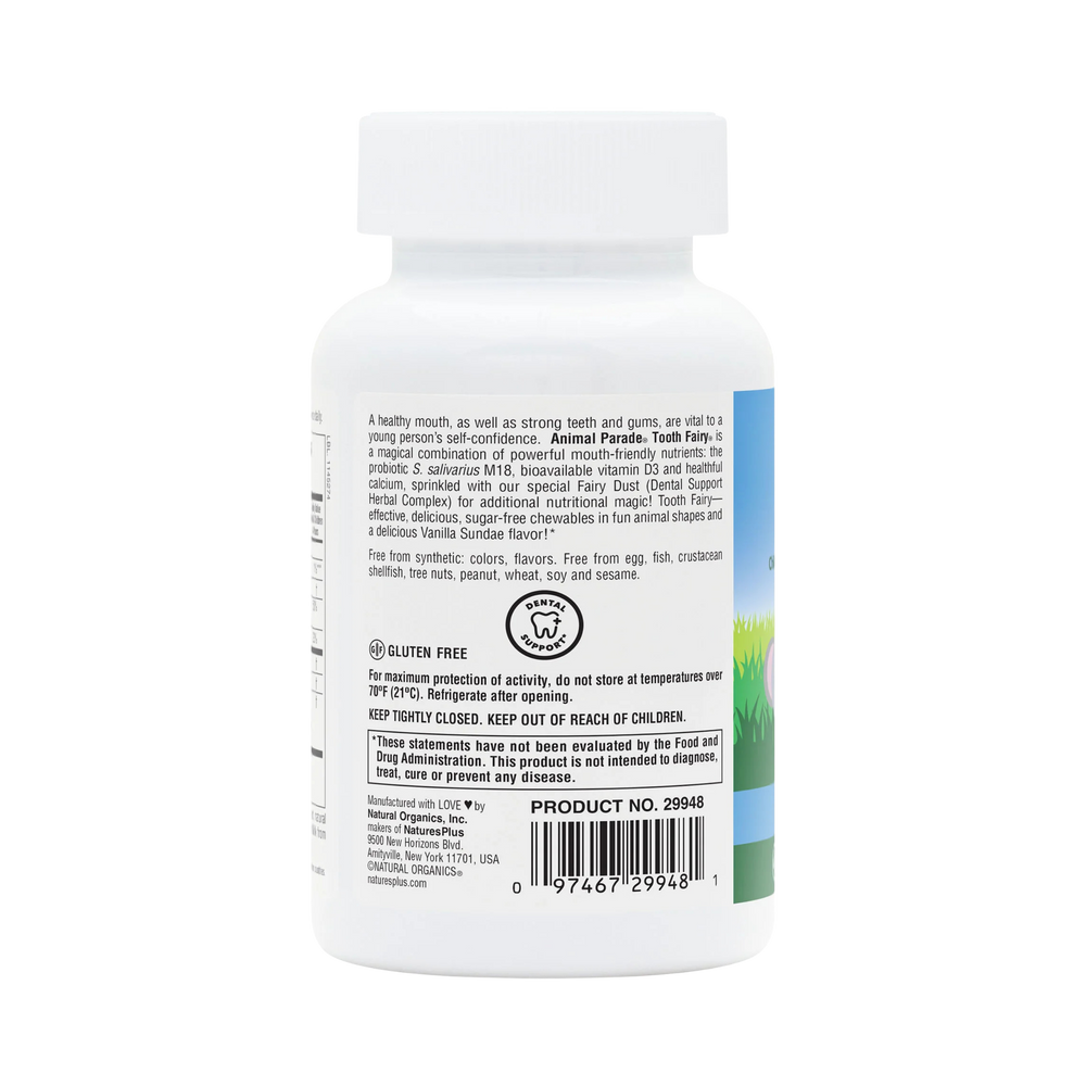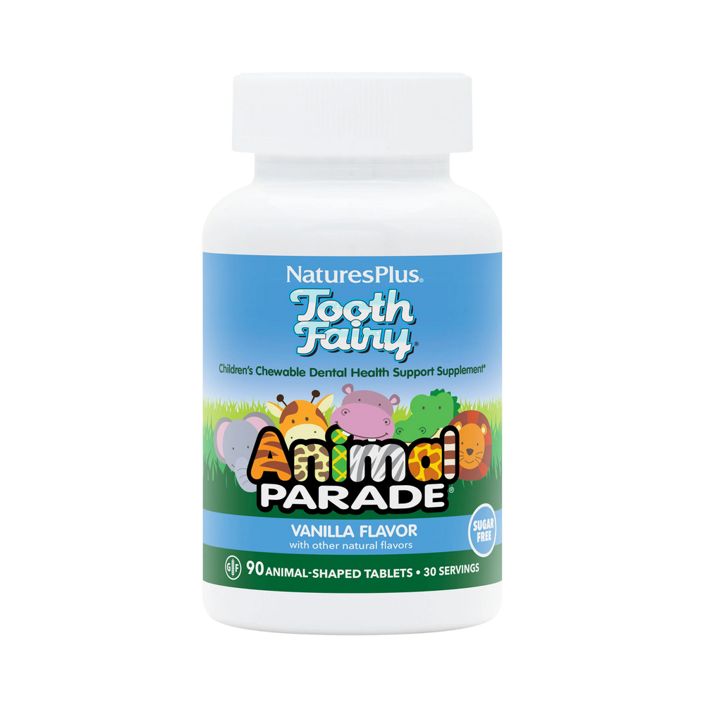 Animal Parade® Tooth Fairy® Children's Chewable is the exciting new supplement with live M18 probiotic cells, L. acidophilus, tooth-building vitamin D3 and calcium, and xylitol, which may reduce the risk of tooth decay. Delicious vanilla Tooth Fairy Chewables, in fun animal shapes, also contain a targeted whole food blend of natural tooth-friendly nutrients.