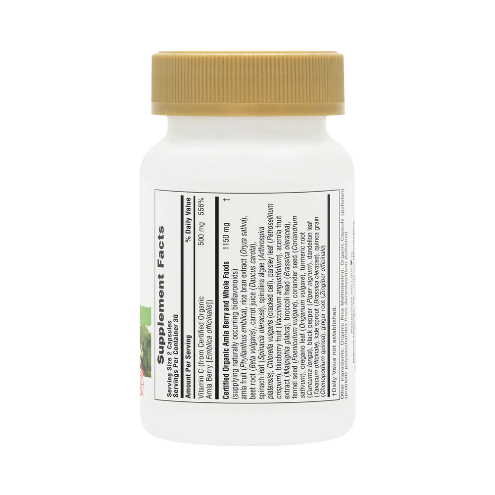 Source of Life Garden Vitamin C Caps with Certified Organic Nutrients is the exciting organic and vegan supplement with 500 mg of pure vitamin C and 90 mg bioflavonoids from 100% certified organic alma berry and acerola cherry, complemented by the synergistic phytonutrients in more than 20 whole foods. This pure formula, in easy-to-swallow vegan capsules, includes natural whole food enzymes for maximum support.