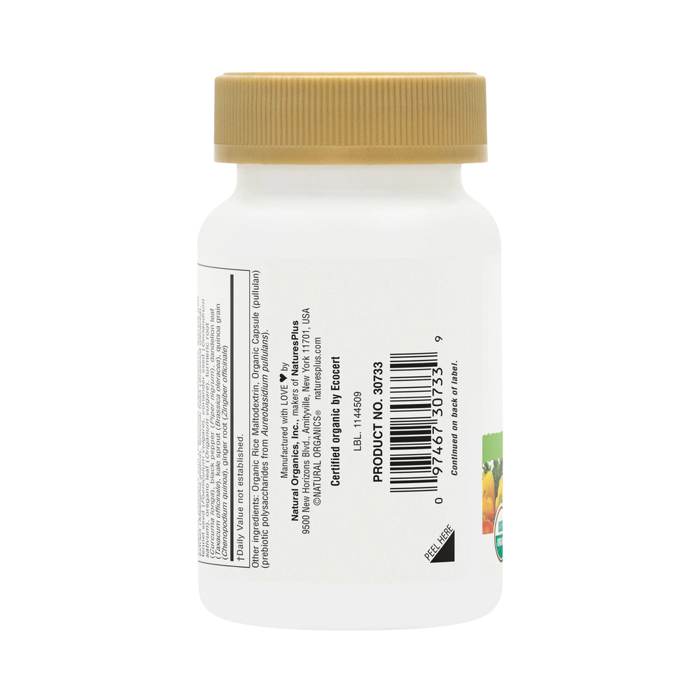 Certified organic whole food blend (rice maltodextrin§, rice protein§, acerola extract§, black pepper§, broccoli sprout§, cauliflower sprout§, coriander§, cordyceps mushroom mycelia§ [cordyceps sinensis], fennel seed§, kale sprout§, maitake mushroom mycelia§ [grifola frondosa], oregano§, parsley§, beet juice§, carrot juice§, spirulina§, turmeric root§, shiitake mushroom mycelia§ [lentinula edodes], spinach§, tomato juice§, bilberry§, blueberry§, chlorella§), organic capsule (pullulan prebiotic polysaccharides [from aureobasidium pullulans]).