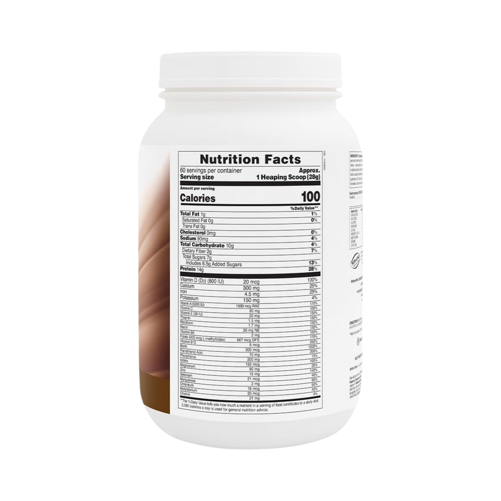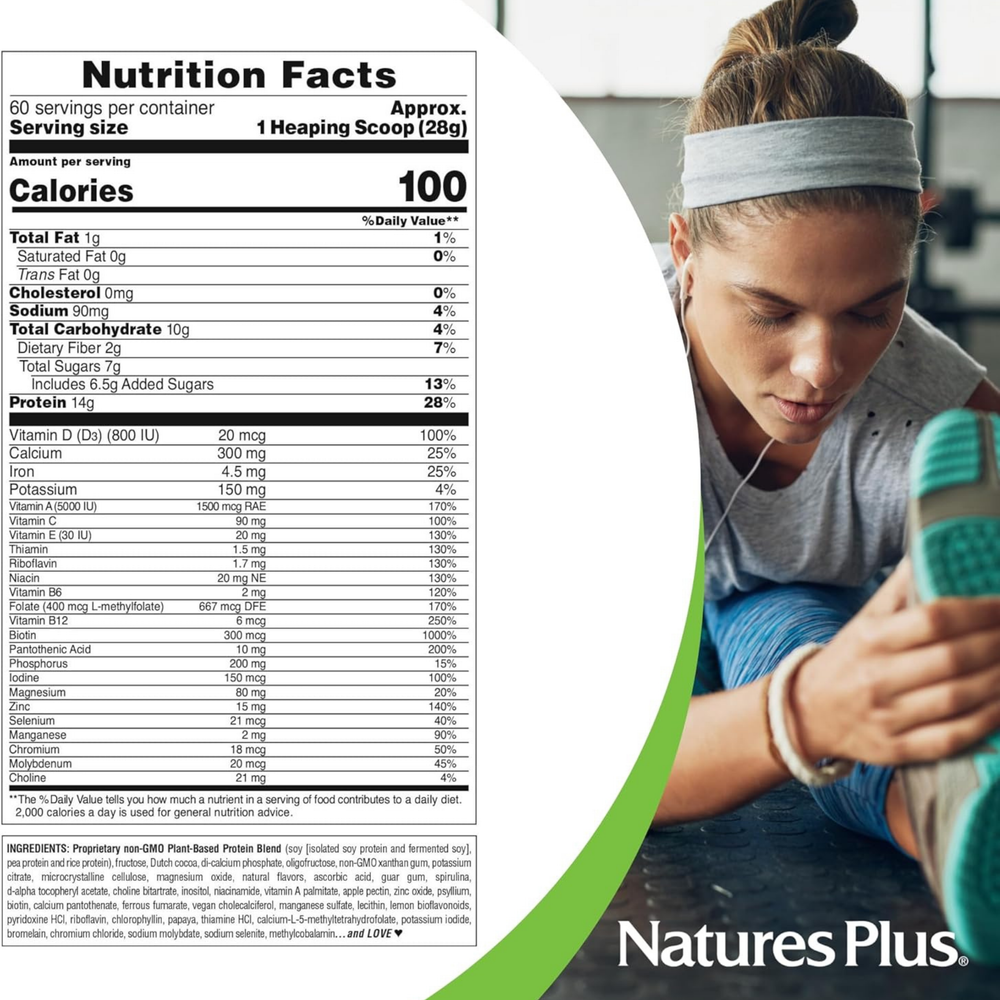 Proprietary non-GMO Plant-Based Protein Blend (soy [isolated soy protein and fermented soy], pea protein and rice protein), fructose, Dutch cocoa, di-calcium phosphate, oligofructose, non-GMO xanthan gum, potassium citrate, microcrystalline cellulose, magnesium oxide, natural flavors, ascorbic acid, guar gum, spirulina, d-alpha tocopheryl acetate, choline bitartrate, inositol, niacinamide, vitamin A palmitate, apple pectin, zinc oxide, psyllium, biotin, calcium pantothenate, ferrous fumarate, vegan cholecalciferol, manganese sulfate, lecithin, lemon bioflavonoids, pyridoxine HCl, riboflavin, chlorophyllin, papaya, thiamine HCl, calcium-L-5-methyltetrahydrofolate, potassium iodide, bromelain, chromium chloride, sodium molybdate, sodium selenite, methylcobalamin...and love