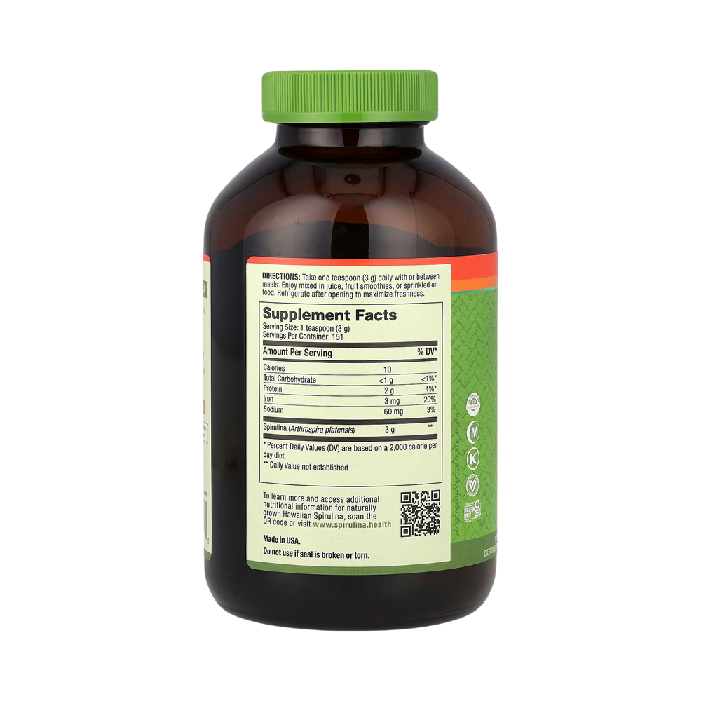Naturally contains vitamins A, K, and B12, magnesium, phycocyanin, GLA, chlorophyll, and zeaxanthin.