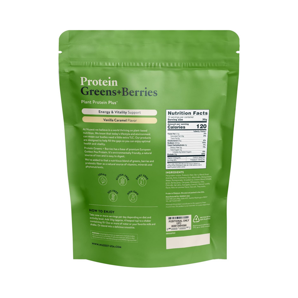 | Pea protein isolate, Prebiotic fiber, Berries Blend (Acai, Acerola, Amla, Cranberry, Goji, Jabuticaba, Mangosteen, Maqui, Pomegranate, Strawberry), Natural vanilla flavor, Greens Blend (Alfalfa grass, Barley grass, Oat grass, Wheatgrass, Kale, Chlorella, Spirulina, Astragalus, Lemon), Natural caramel flavor, Sea salt, Thaumatin. |