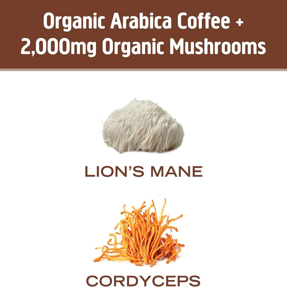 Our superfood mushroom blend of lion's mane and cordyceps are added to 100% Arabica coffee for a bold, chocolatey coffee with a rich, full-bodied flavor. Each serving contains 2,000 mg of organic whole food mushroom powder containing 400 mg beta-glucans, providing immune support.