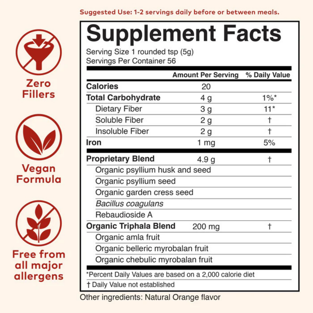 Proprietary Blend: Organic psyllium husk Organic psyllium seed Organic garden cress seed Bacillus coagulans Rebaudioside A |