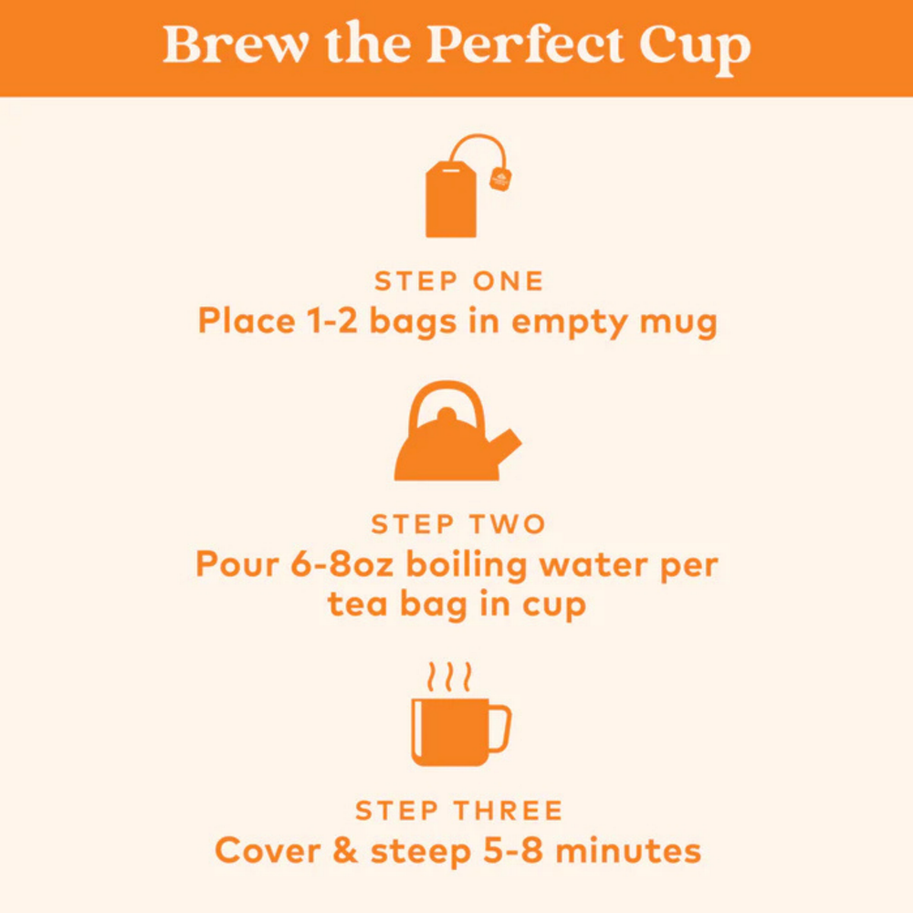 Use 1 infusion bag per cup of just boiled water. Cover and steep for 5-10 min.