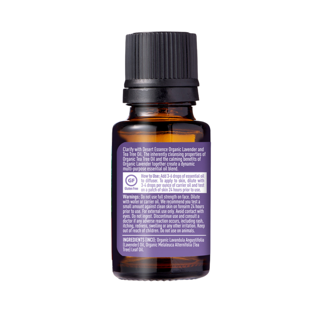 A clarifying essential lavender tea tree oil blend that helps soothe and cleanse. The inherently cleansing properties of Organic Tea Tree Oil and the calming benefits of Lavender together create a dynamic multi-purpose essential oil. Place a few drops in a diffuser to help relax and cleanse air, apply with a carrier oil to help soothing blemishes and problem skin areas or place a few drops to detergent to freshen laundry. USDA-certified organic.
