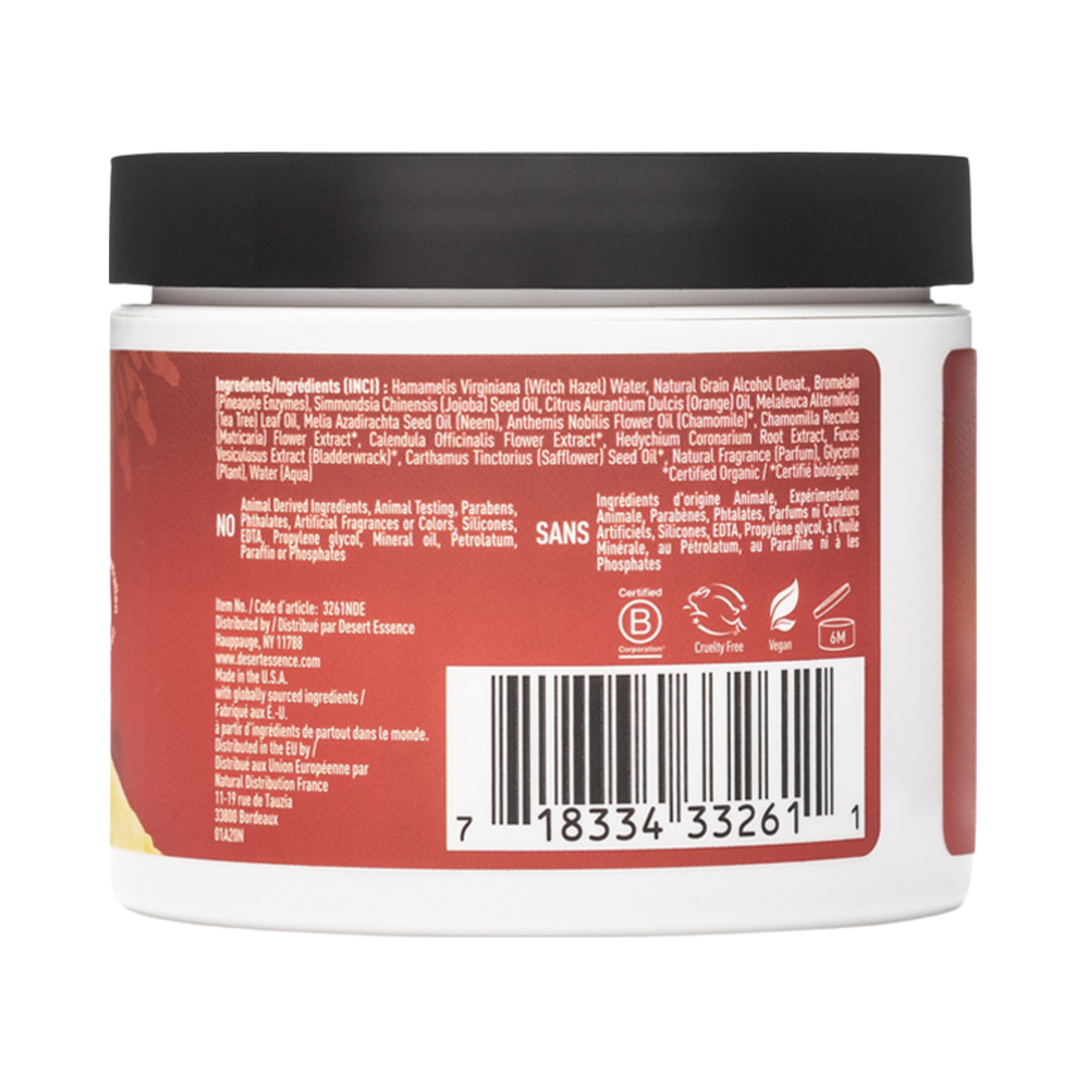 Hamamelis Virginiana (Witch Hazel) Water, Natural Grain Alcohol Denat., Bromelain (Pineapple Enzymes), Simmondsia Chinensis (Jojoba) Seed Oil, Citrus Aurantium Dulcis (Orange) Oil, Melaleuca Alternifolia (Tea Tree) Leaf Oil , Melia Azadirachta Seed Oil (Neem), Anthemis Nobilis Flower Oil (Chamomile)*, Chamomilla Recutita (Matricaria) Flower Extract*, Calendula Officinalis Flower Extract*, Hedychium Coronarium Root Extract, Fucus Vesiculosus Extract (Bladderwrack)*, Carthamus Tinctorius (Safflower) Seed Oil*, Natural Fragrance (Parfum), Glycerin (Plant), Water (Aqua) *Certified Organic