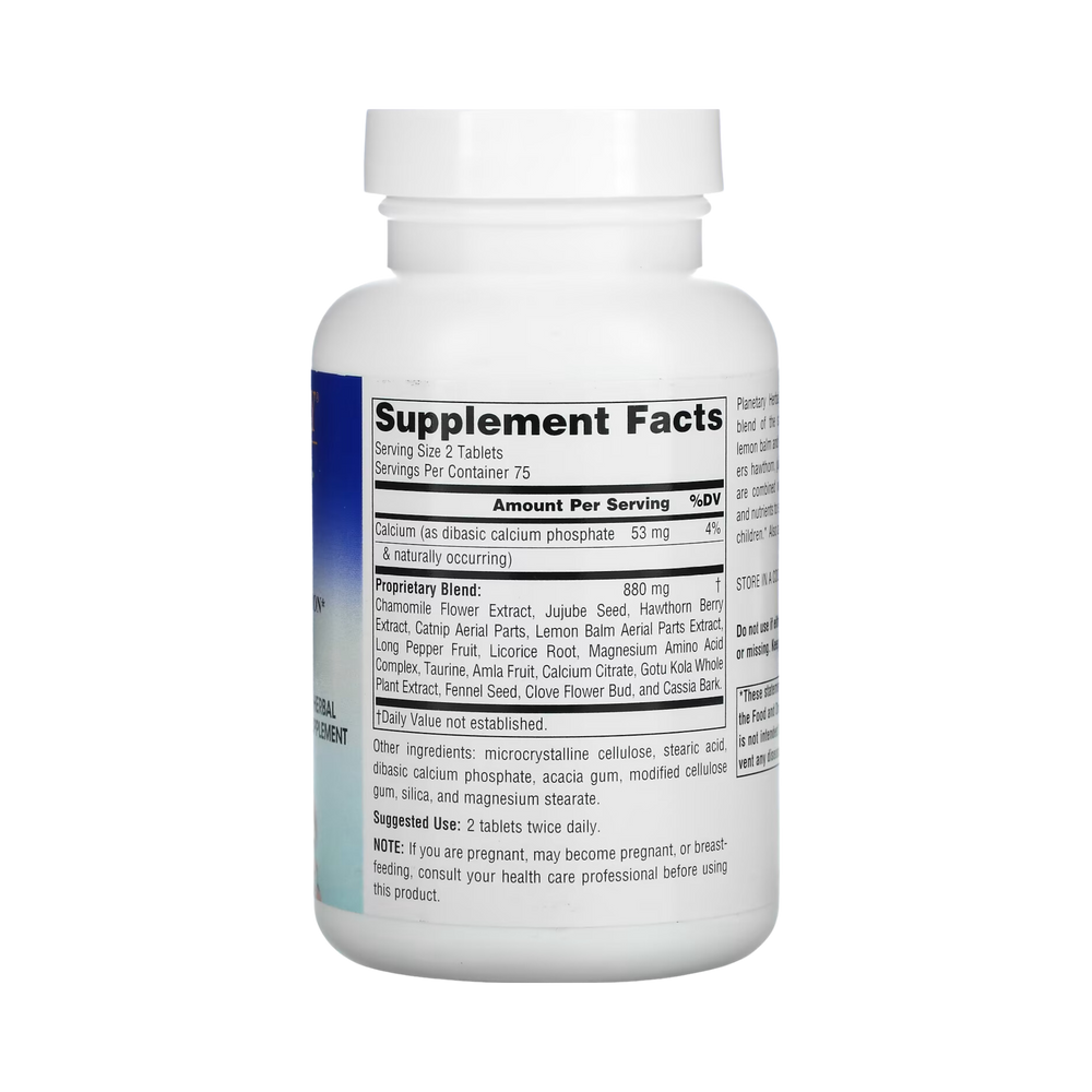Chamomile Flower Extract, Jujube Seed, Hawthorn Berry Extract, Catnip Aerial Parts, Lemon Balm Aerial Parts Extract, Long Pepper Fruit, Licorice Root, Magnesium Amino Acid Complex, Taurine, Amla Fruit, Calcium Citrate, Gotu Kola Whole Plant Extract, Fennel Seed, Clove Flower Bud, and Cassia Bark. 880 mg