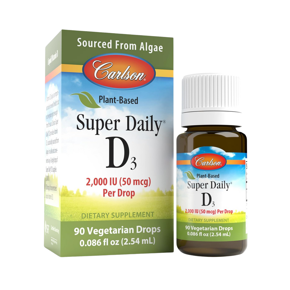 Plant-Based Super Daily D3 is sustainably sourced from algae and provides 2,000 IU (50 mcg) of vegetarian vitamin D3 in a single drop to promote overall health. Vitamin D is a vitamin we can get through food and also a hormone our body makes from the sun. Despite the multiple ways of getting vitamin D, many are still deficient due to changing seasons, sunscreen, skin tone, age, and sun protection. Plant-Based Super Daily D3 is made from 100% non-GMO plant-origin algae and is pure, crystalline vitamin D3 (cholecalciferol). It's sustainably and responsibly sourced in a controlled environment in Europe, protected from environmental contaminants and is fully traceable. Get our daily dose of vitamin D3 is easy. Place a drop of Plant-Based Super Daily D3 in food or drink or take it from a spoon or clean hand.
