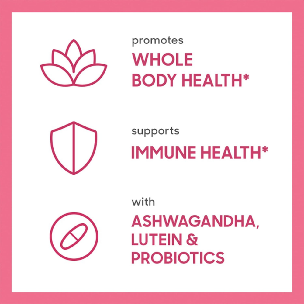 Woman's Botanical Blend Organic pomegranate (fruit) concentrate, ashwagandha (root) extract, grape (pulp, seed, skin) extract, organic chlorella, lutein (from Aztec Marigold flower). |