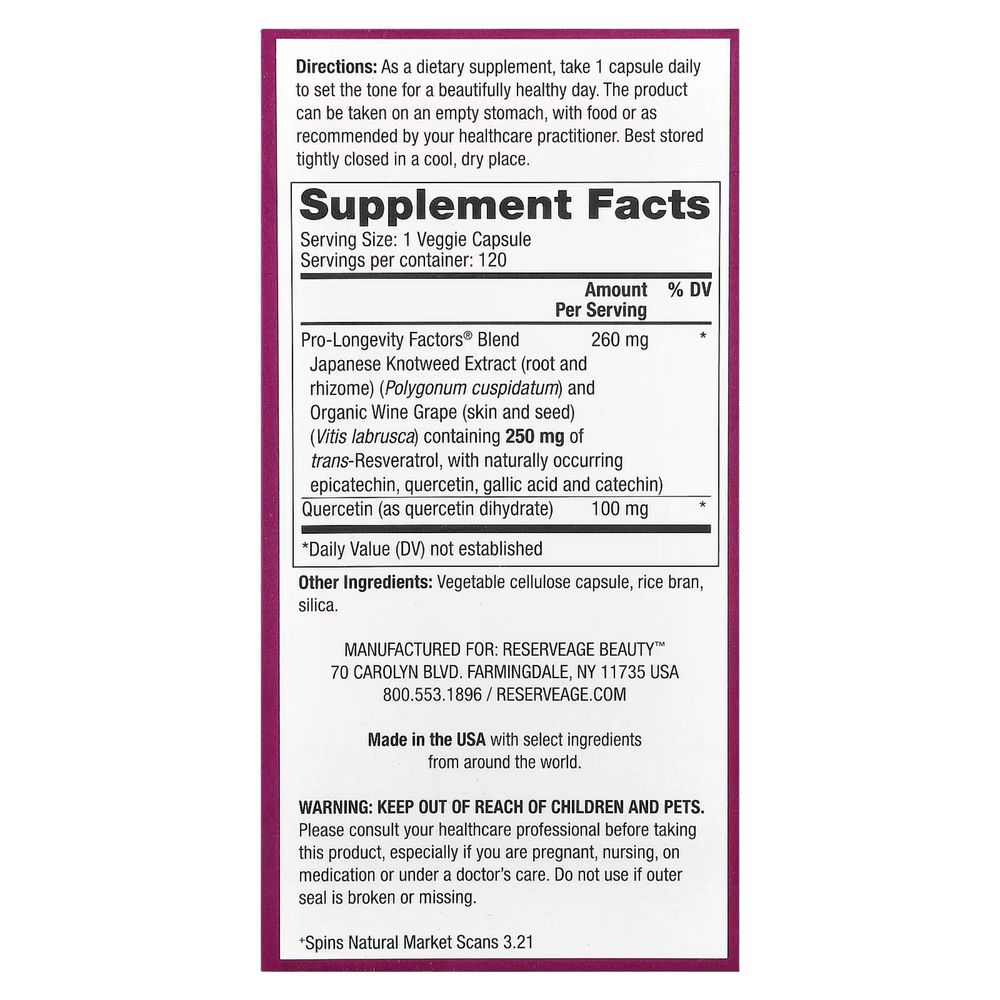| Pro-Longevity Factors® BlendJapanese Knotweed Extract (root and rhizome) (Polygonum cuspidatum) and organic European Wine Grape (skin and seed) (Vitis labrusca) containing 250 mg of trans-Resveratrol, with naturally occurring epicatechin, quercetin, gallic acid and catechin) |