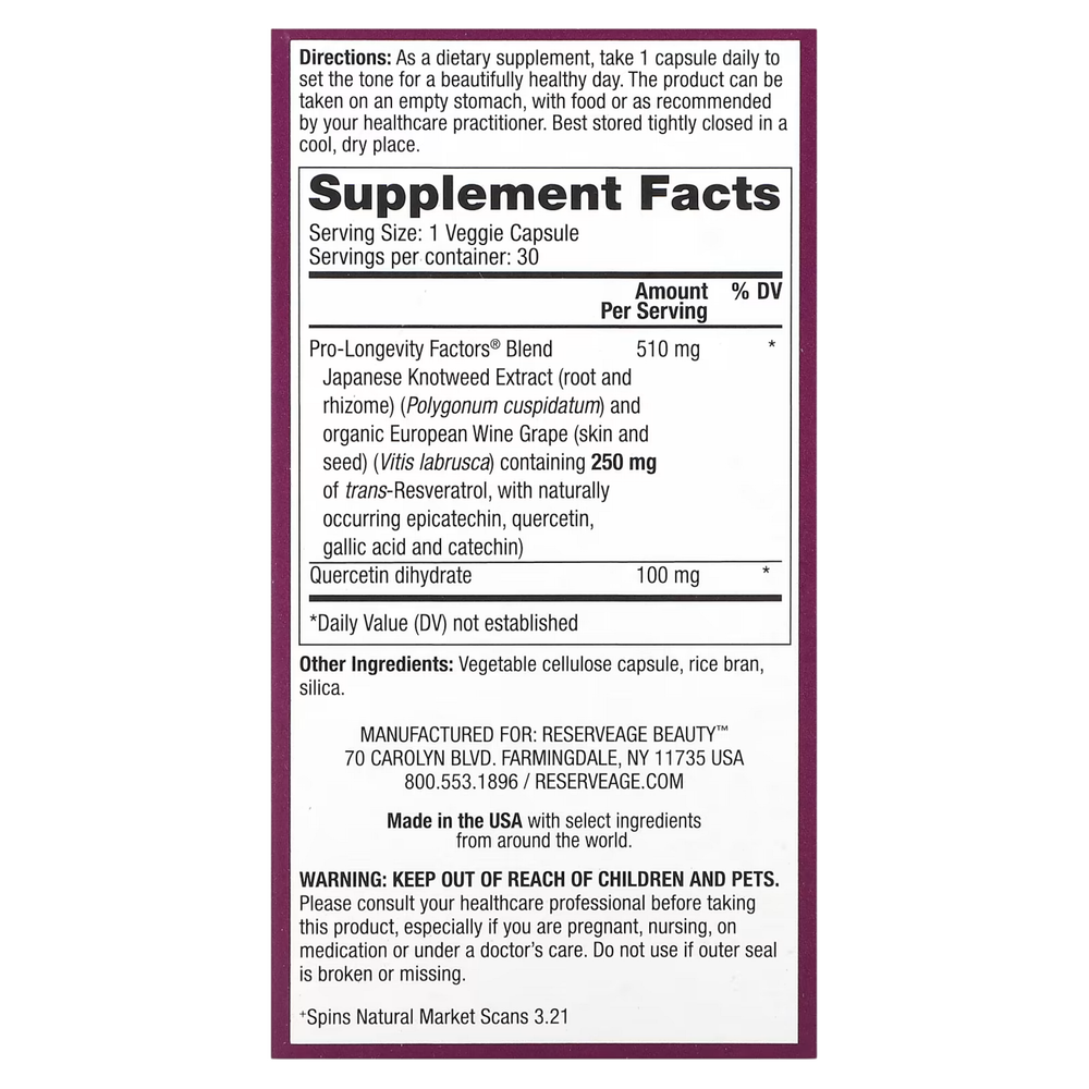Reserveage Beauty, Resveratrol, 250 mg, 30 Veggie Capsules