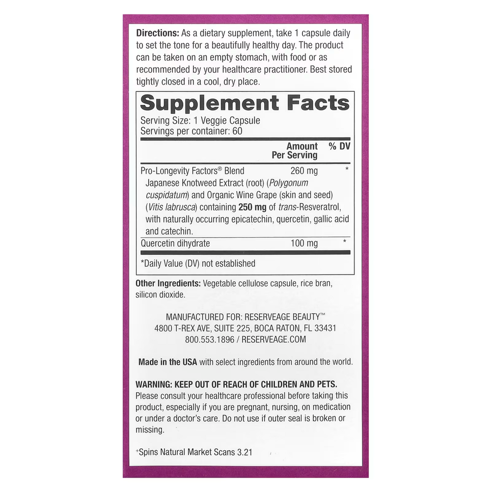 Reserveage Beauty, Resveratrol, 250 mg, 60 Veggie Capsules