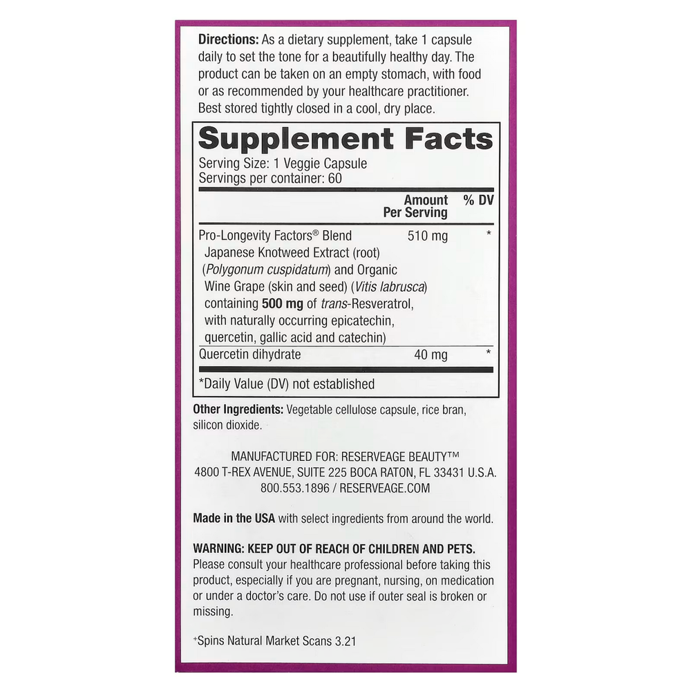Reserveage Beauty, Resveratrol, Trans-Resveratrol, 500 mg, 60 Veggie Capsules