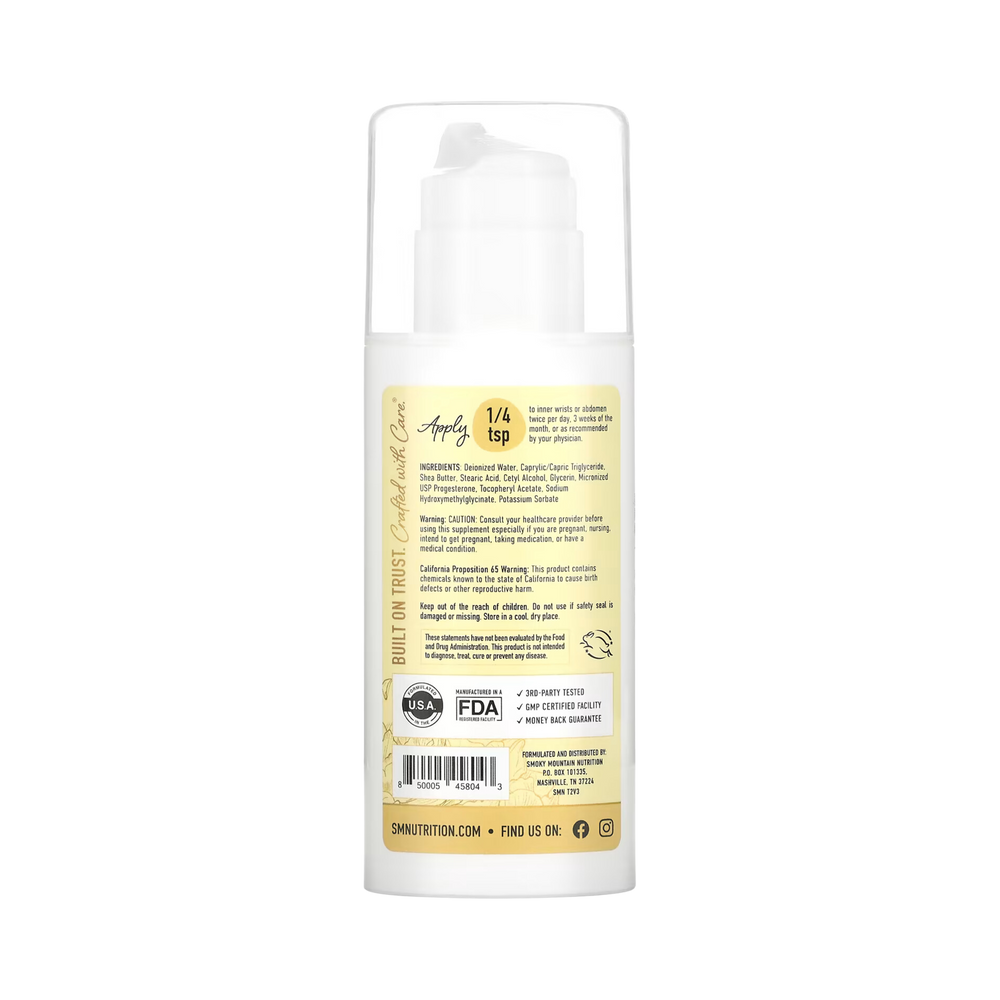 Each 4oz. pump contains 2,000mg of Micronized, USP progesterone. Each serving contains ~21mg. With twice-daily servings and high-quality ingredients, our cream is intentionally formulated for optimal balance at midlife. Like every product from SMNutrition, Advanced Formula Progesto-Life is extensively tested. Every batch is third-party tested and manufactured in FDA-Registered facilities that adhere to GMP guidelines.