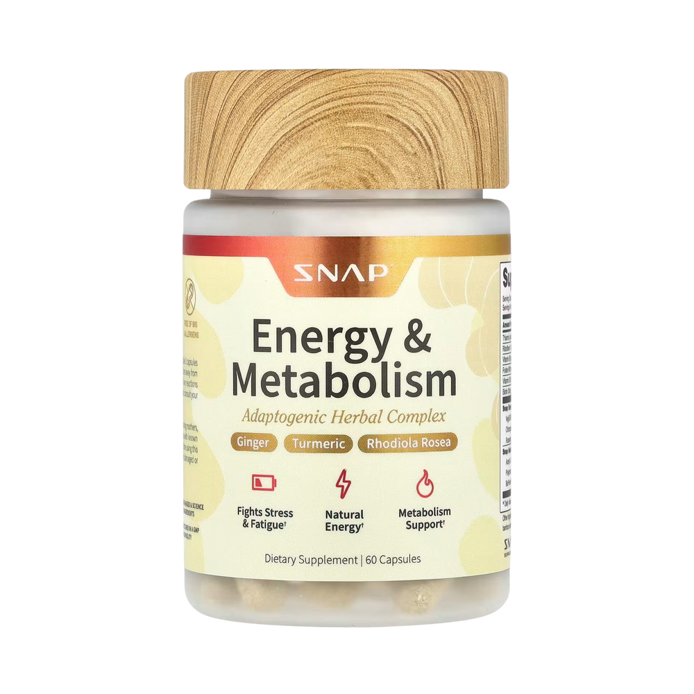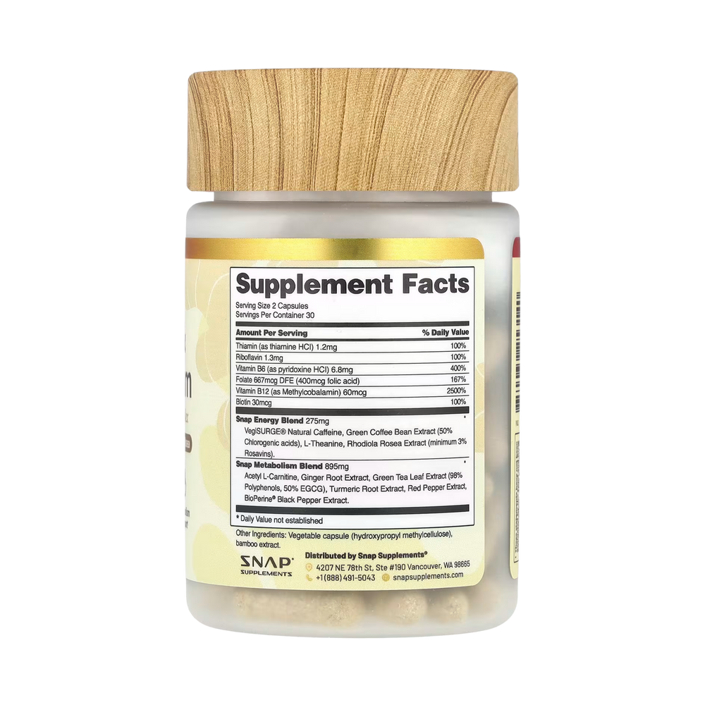 | Snap Metabolism Blend Acetyl L-Carnitine, Ginger Root Extract, Green Tea Leaf Extract (98% Polyphenols, 50% EGCG), Turmeric Root Extract, Red Pepper Extract, BioPerine® Black Pepper Extract. |