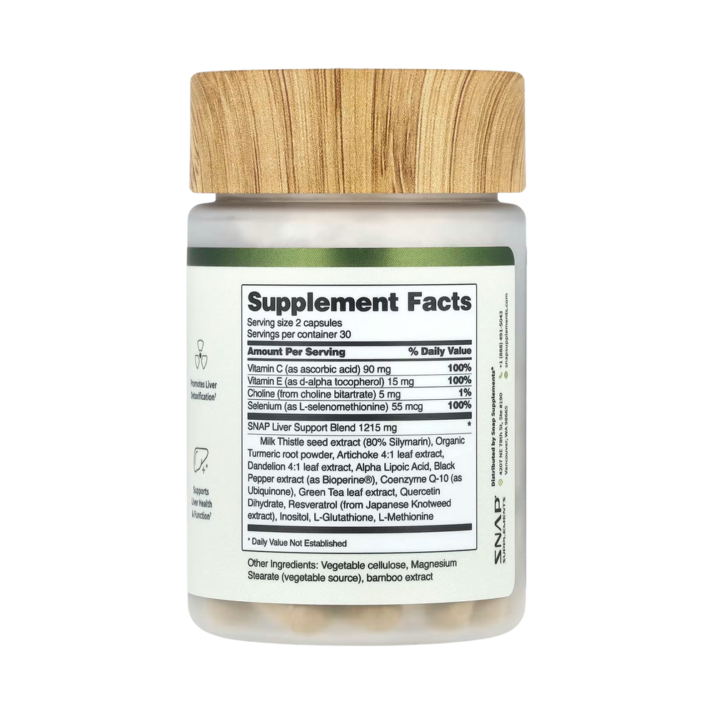 | SNAP Liver Support Blend Milk Thistle seed extract (80% Silymarin), Organic Turmeric root powder, Artichoke 4:1 leaf extract, Dandelion 4:1 leaf extract, Alpha Lipoic Acid, Black Pepper extract (as Bioperine®), Coenzyme Q-10 (as Ubiquinone), Green Tea leaf extract, Quercetin Dihydrate, Resveratrol (from Japanese Knotweed extract), Inositol, L-Glutathione, L-Methionine |