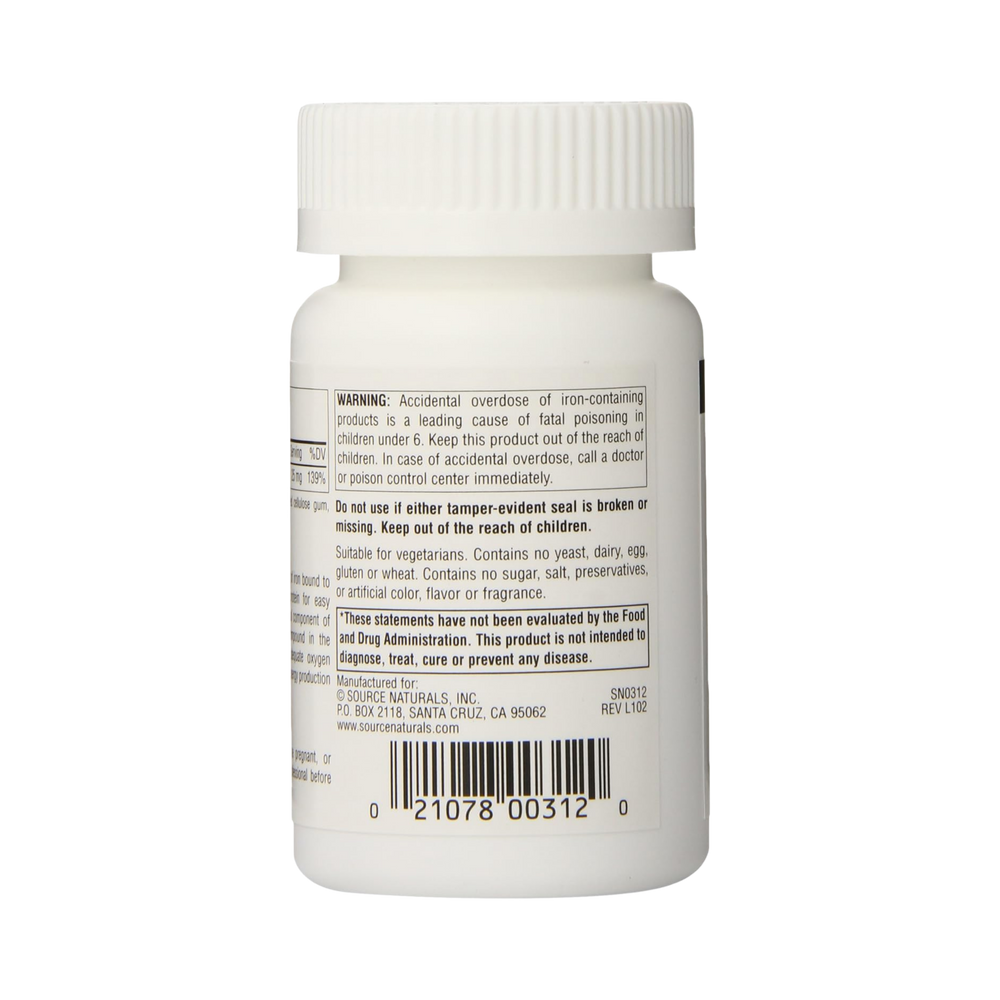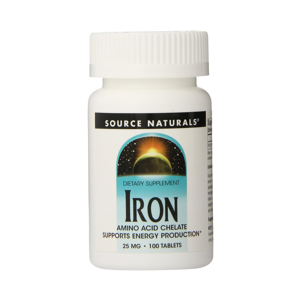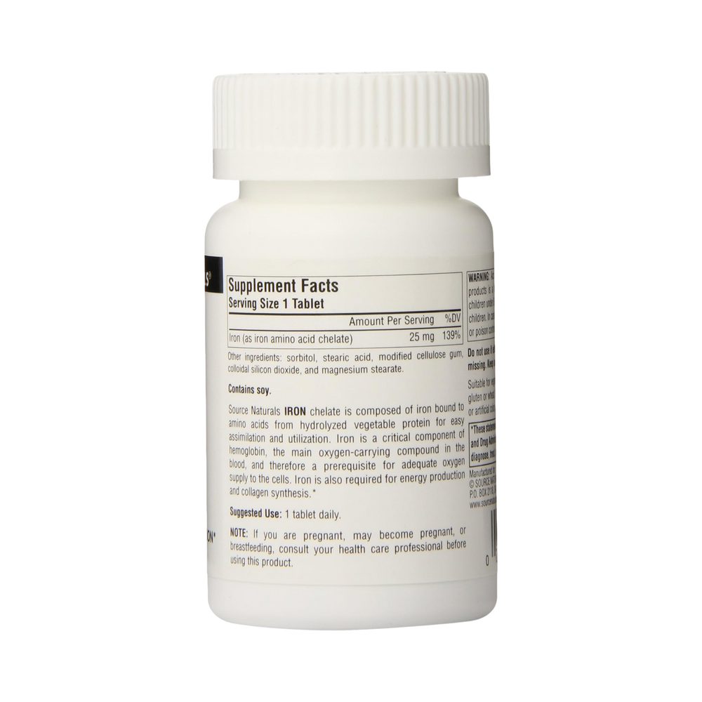 Source Naturals Iron chelate is composed of iron bound to amino acids from hydrolyzed vegetable protein for easy assimilation and utilization. Iron is a critical component of hemoglobin, the main oxygen-carrying compound in the blood, and therefore a prerequisite for adequate oxygen supply to the cells. Iron is also required for energy production and collagen synthesis.