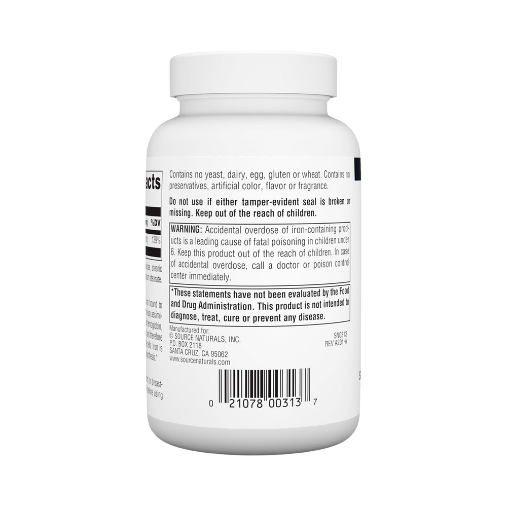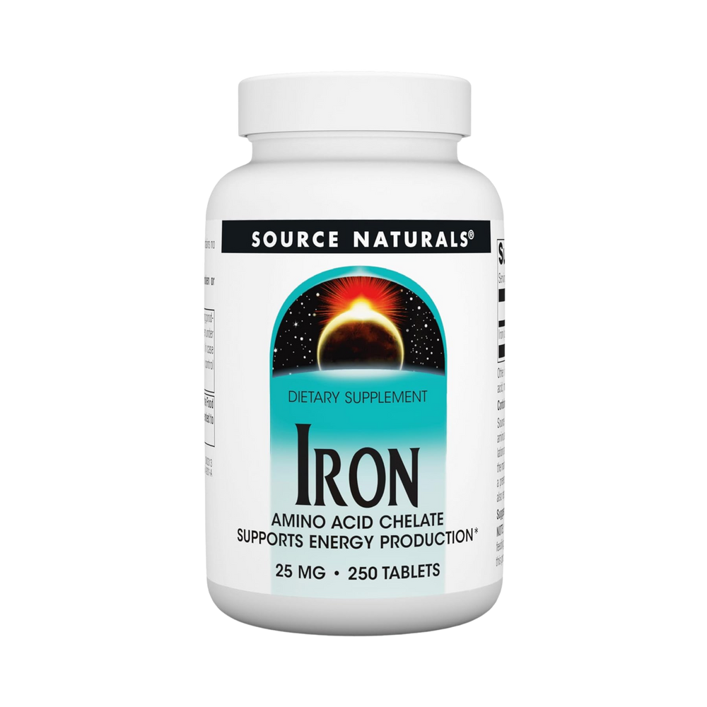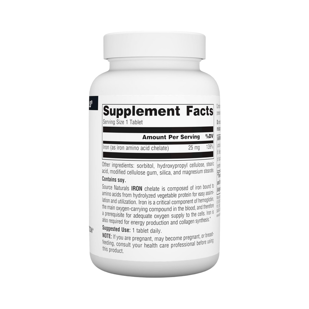 Source Naturals Iron chelate is composed of iron bound to amino acids from hydrolyzed vegetable protein for easy assimilation and utilization. Iron is a critical component of hemoglobin, the main oxygen-carrying compound in the blood, and therefore a prerequisite for adequate oxygen supply to the cells. Iron is also required for energy production and collagen synthesis.