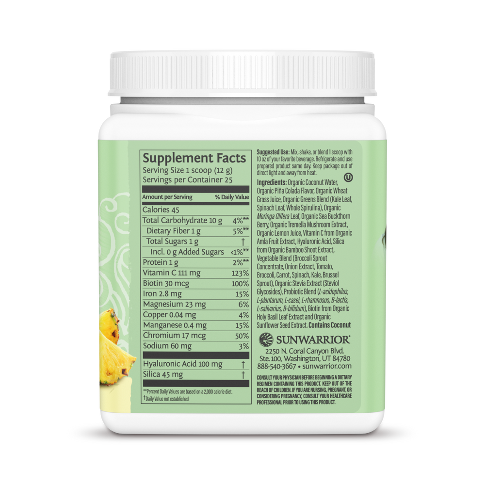 Organic coconut water, organic piña colada flavor, organic wheat grass juice, organic greens blend (kale leaf, spinach leaf, whole spirulina), organic moringa olifera leaf, organic sea buckthorn berry, organic tremella mushroom extract, organic lemon juice, vitamin c from organic amla fruit extract, hyaluronic acid, silica from organic bamboo shoot extract, vegetable blend (broccoli sprout concentrate, onion extract, tomato, broccoli, carrot, spinach, kale, brussel sprout), organic stevia extract (steviol glycosides), probiotic blend (l-acidophilus, l-plantarum, l-casei, l-rhamnosus, b-lactis, l-salivarius, b-bifidum), biotin from organic holy basil leaf extract and organic sunflower seed extract.