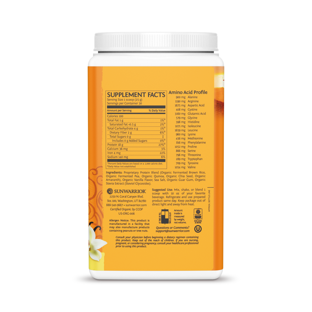 Proprietary protein blend (organic fermented brown rice, organic fermented pea, organic quinoa, organic chia seed, organic amaranth), organic vanilla flavor, sea salt, organic guar gum, organic stevia extract (steviol glycosides).